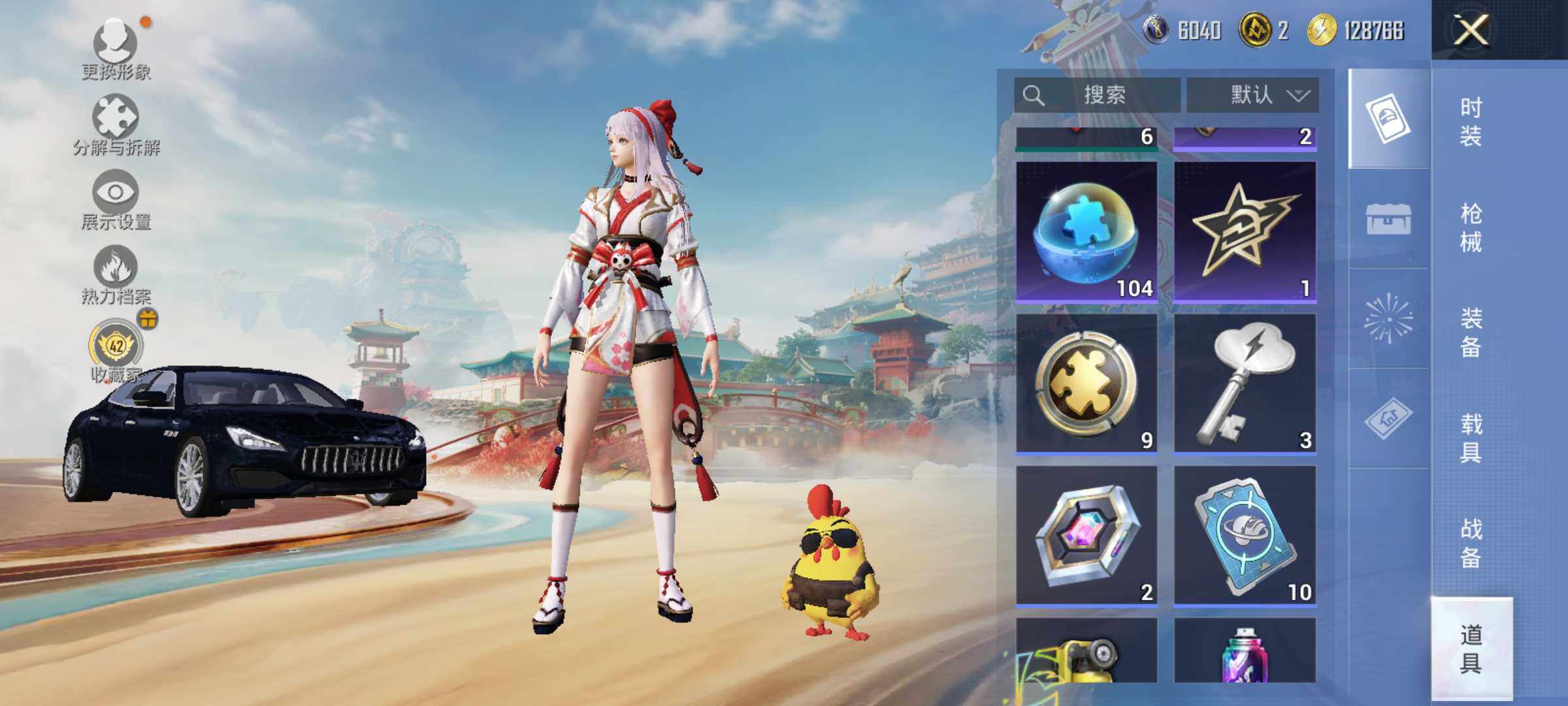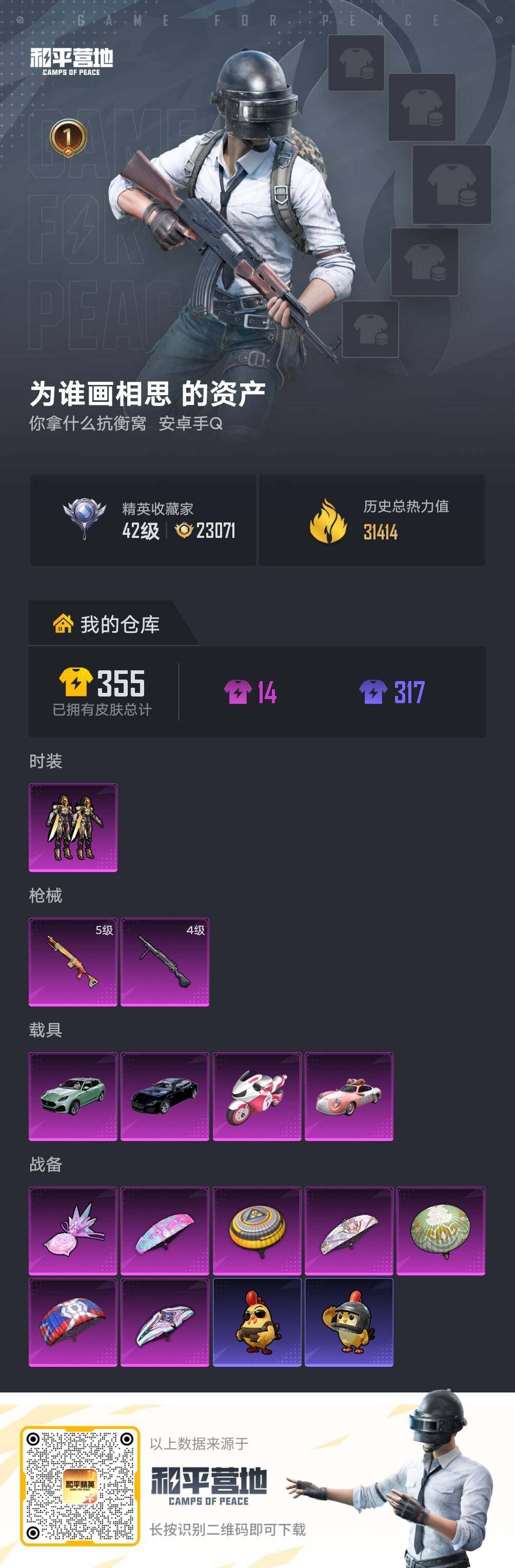 1粉装-2特效枪-4载具-1粉色飞行器-31414热力值-1王牌印记-51套装-104枪皮