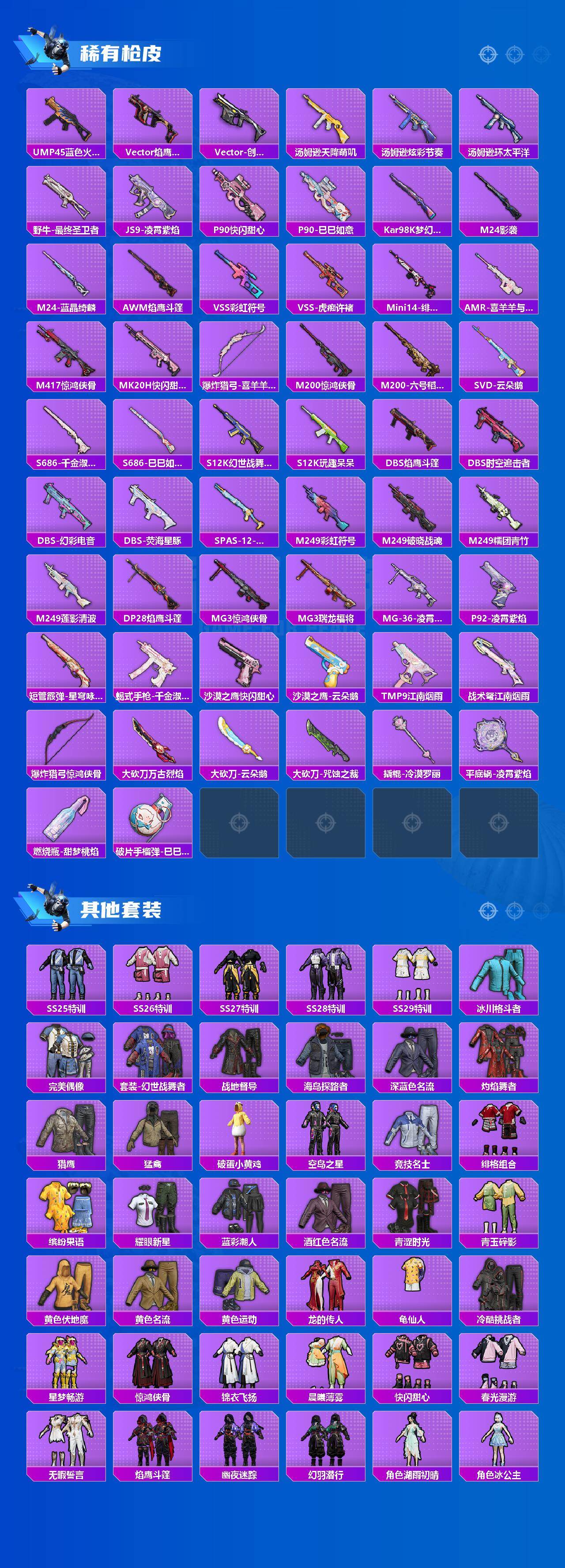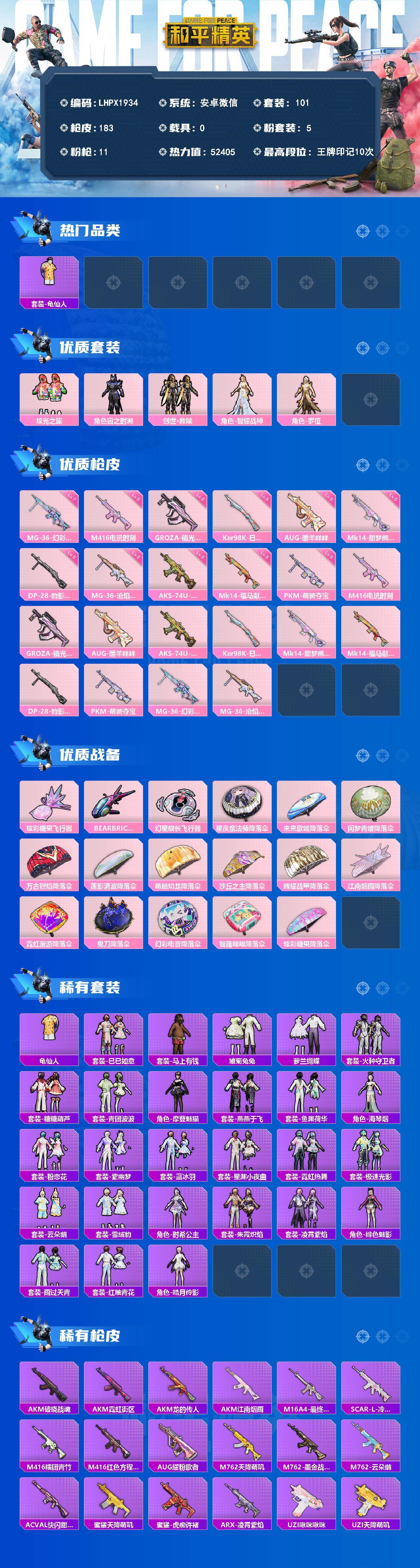 【特价出售/店主推荐】安卓 微信-5粉装-11特效枪-3粉色飞行器-52405热力值-10王牌印记-101套装-183枪皮【热门品类】:套装-龟仙人【粉色套装】:粉装-炫光之旅,角色-宙之时溯,套装-创世·救赎,角色-智耀战神,角色-罗征【粉色枪皮等级】:M416-电玩时刻(五级),GROZA-镜光银凌(五级),AUG-暖羊咩咩(五级),AKS-74U-森灵之息(五级),Kar98K-巳巳如意(五级),Mk14-甜梦熊击(五级),Mk14-福马献瑞(五级),DP-28-豹影疾电(五级),PKM-