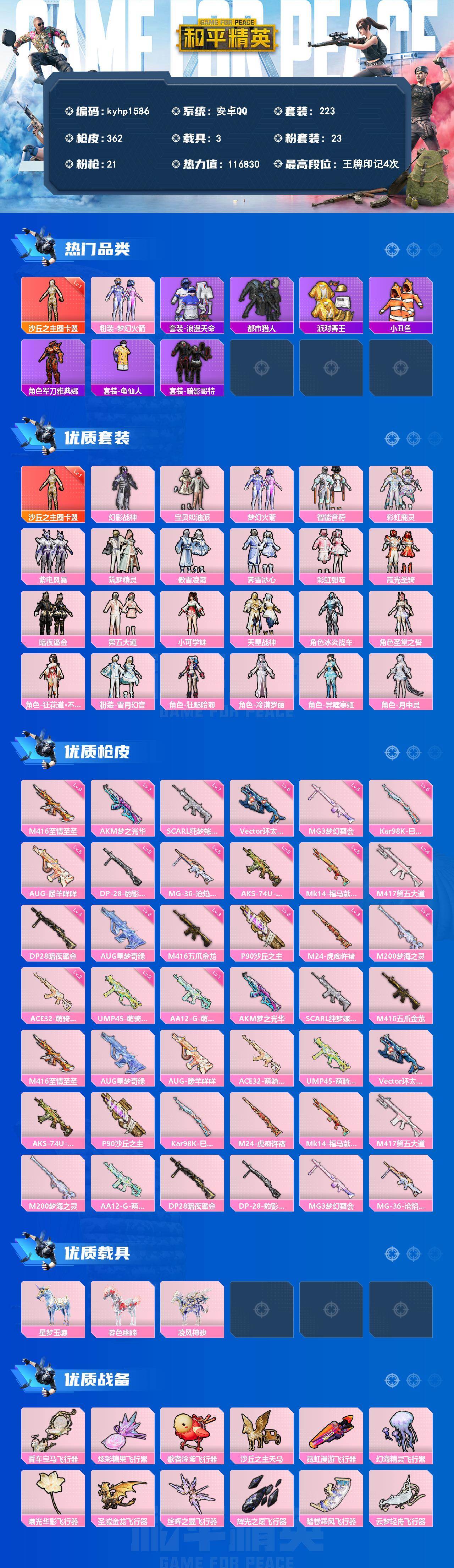 安卓 手Q-1神装-23粉装-21特效枪-3载具-13粉色飞行器-116830热力值-4王牌印记-223套装-362枪皮