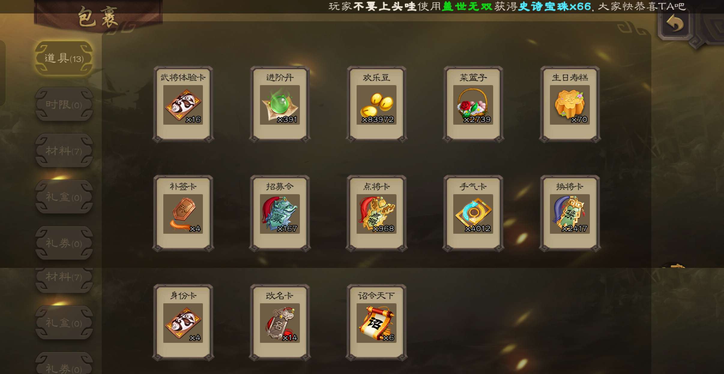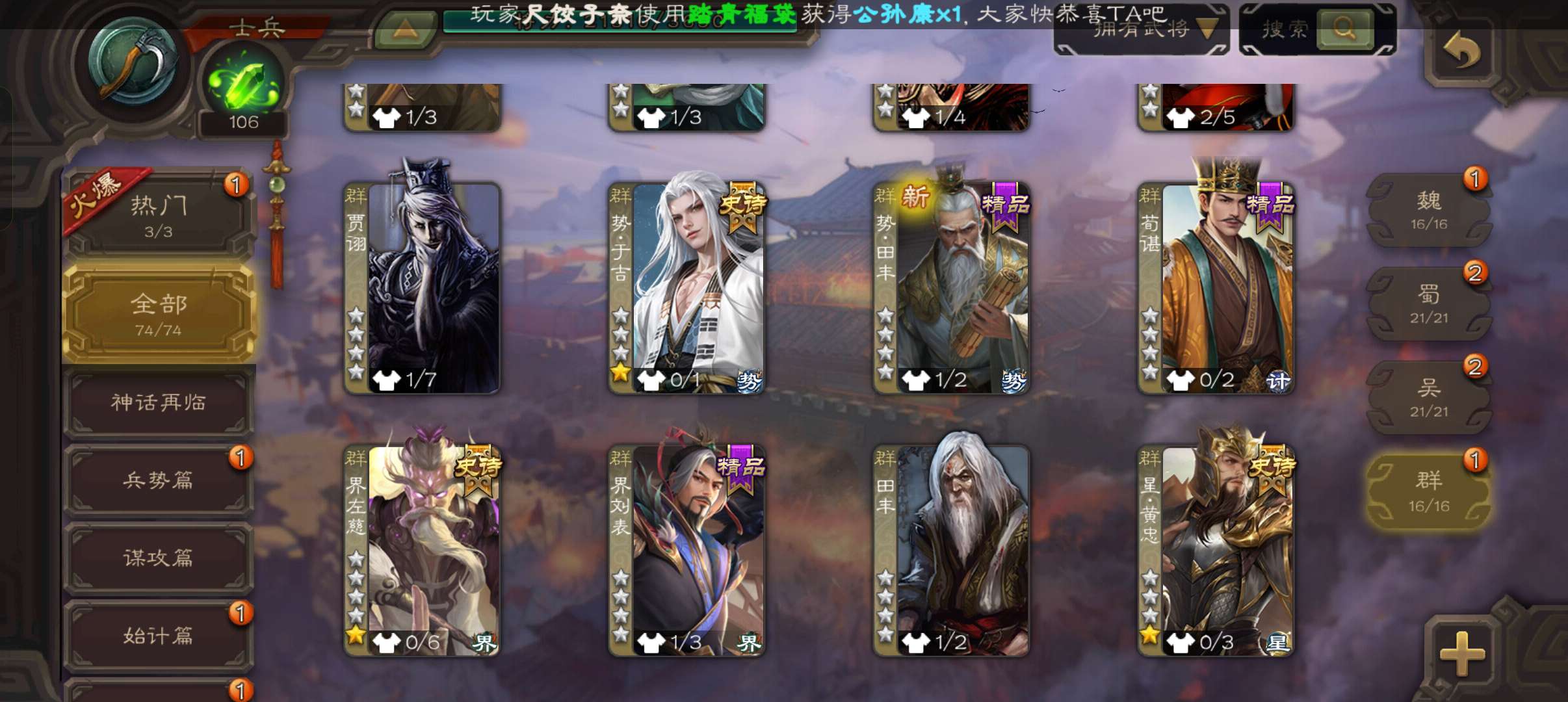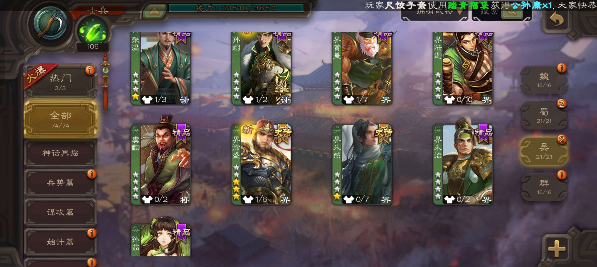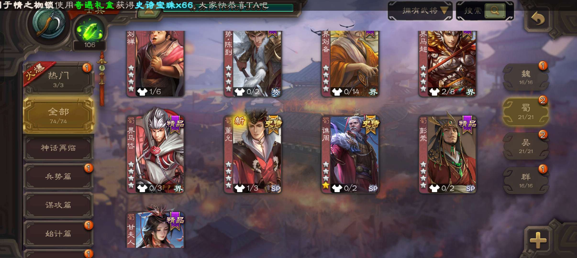 9史诗超级兵,8.7万羽毛8.4万豆,大宝界徐盛势于吉界左慈星黄忠界朱然董允谯周杨修,167招募令