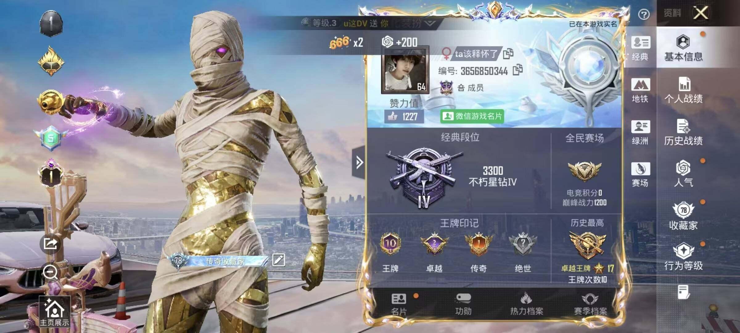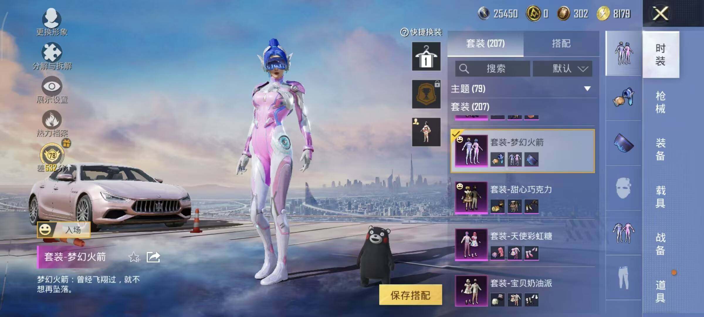 1神装-20粉装-9特效枪-2载具-14粉色飞行器-95764热力值-10王牌印记-207套装-280枪皮