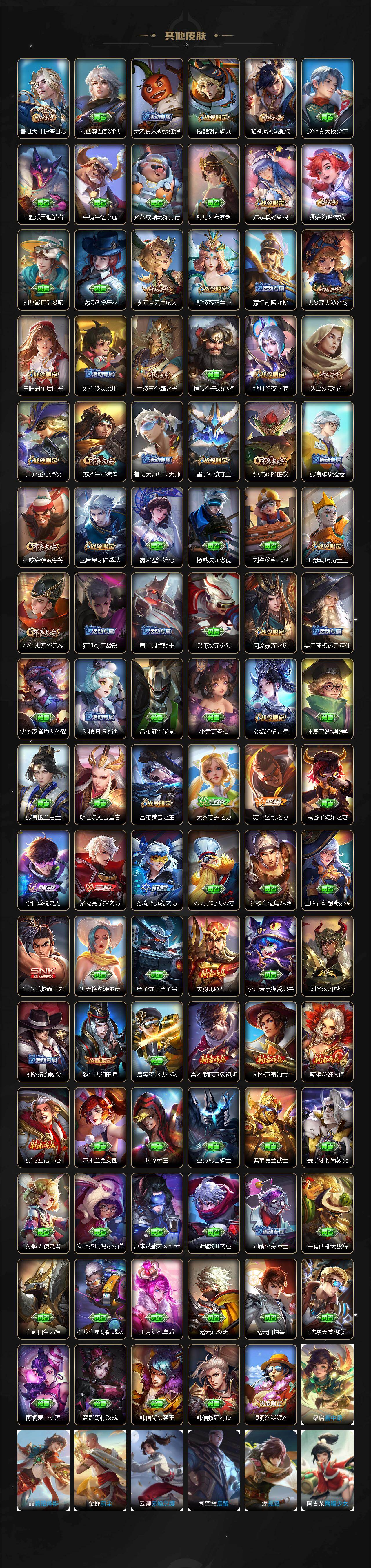 【传说皮肤】:云缨幻光神枪,桑启鸣野蒿,亚连落雪白狼,吕布曦玄引,孙尚香乘龙问璇玑,赵云乘龙铭钟鼎,吕布怒海麟威,李白诗剑行,狄仁杰神器狴犴令,赵云淬星耀世,王昭君乞巧织情,曜李逍遥 ,诸葛亮时雨天司,铠绛天战甲,镜炽阳神光,虞姬启明星使,关羽武圣,曜云