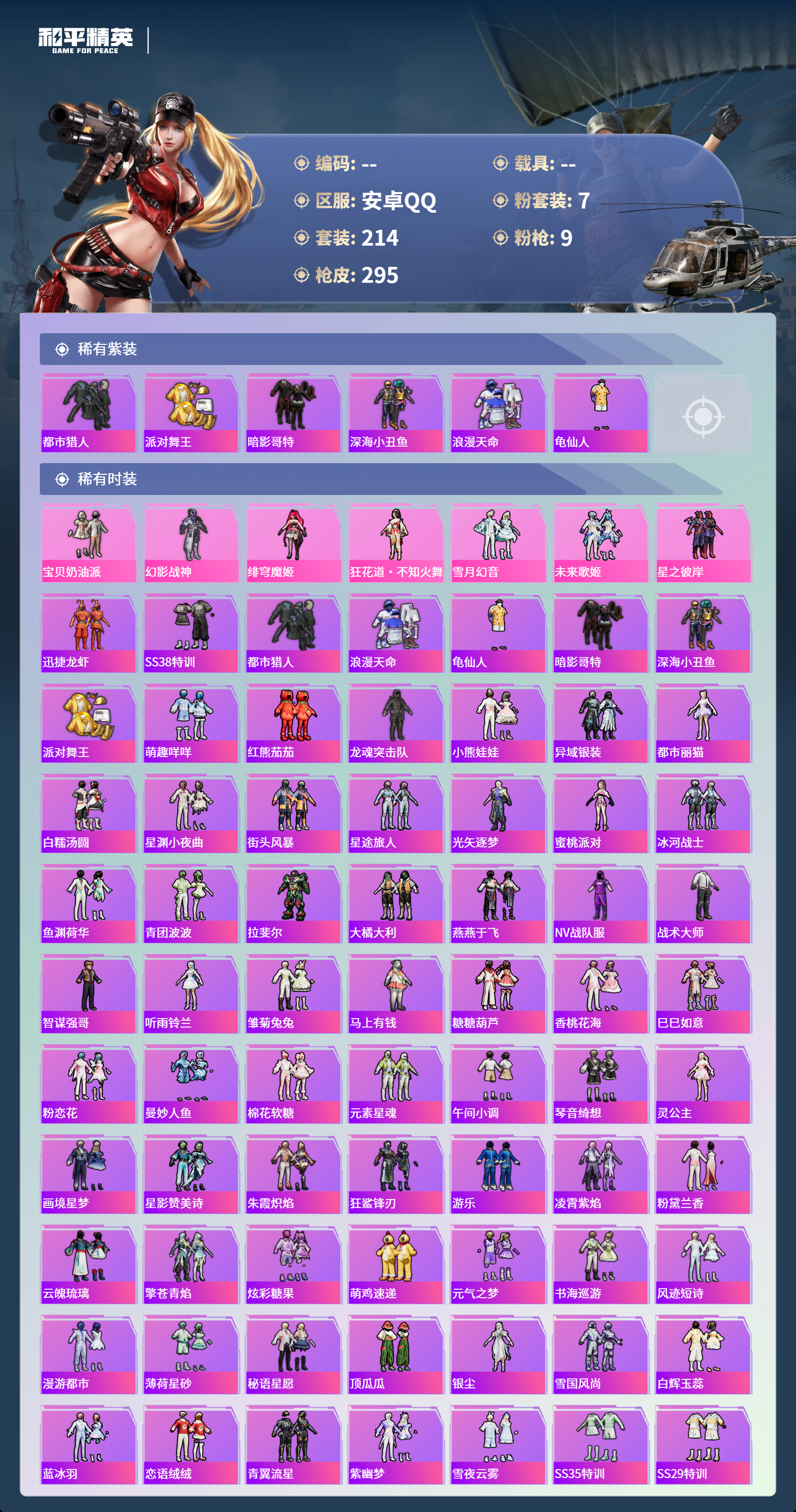 hs67937安卓手Q-8王牌印记-7粉装-9特效枪-88228热力值-214套装-295枪皮-1卓越印记