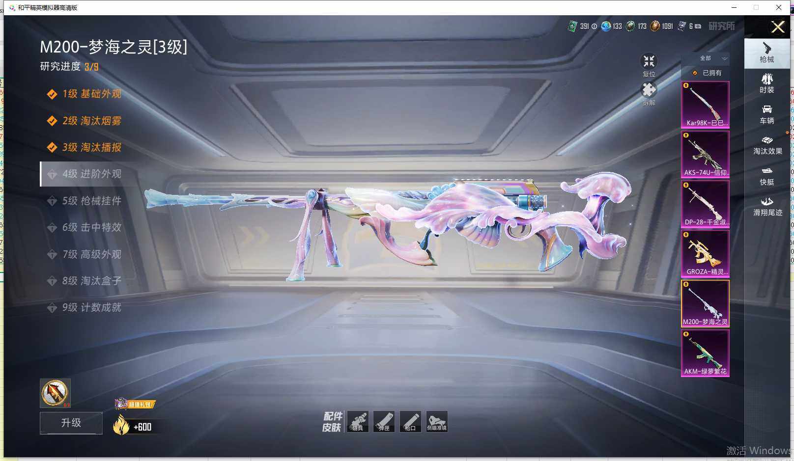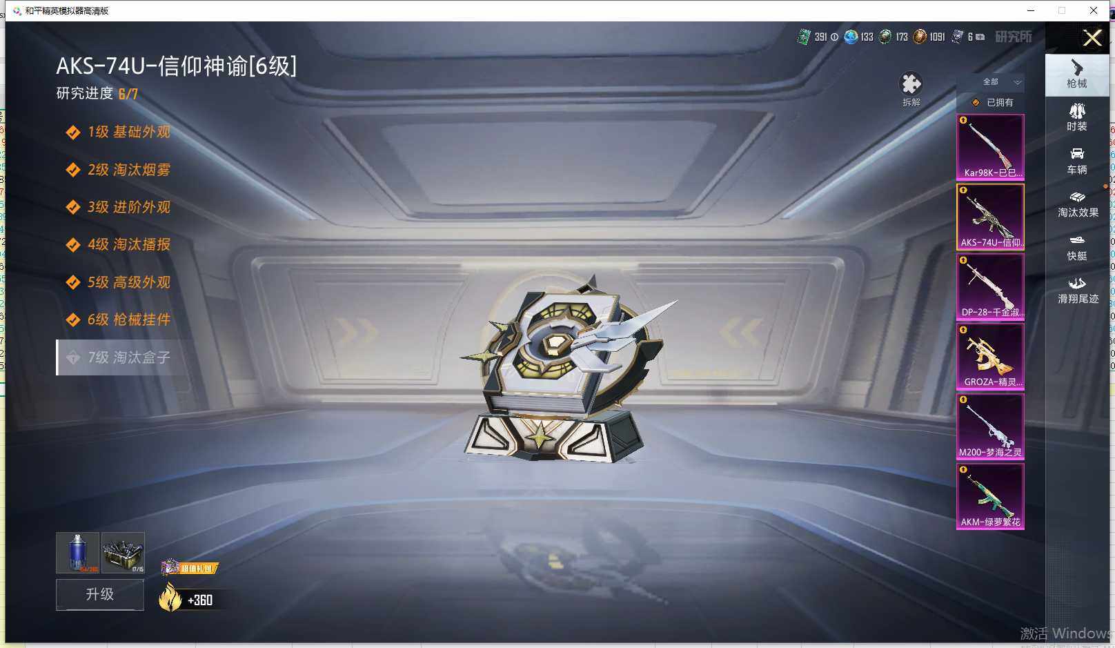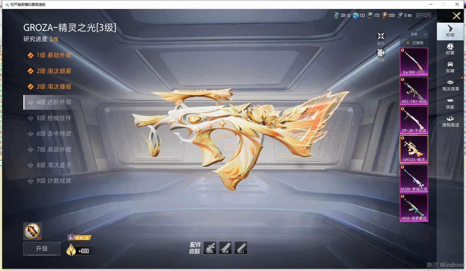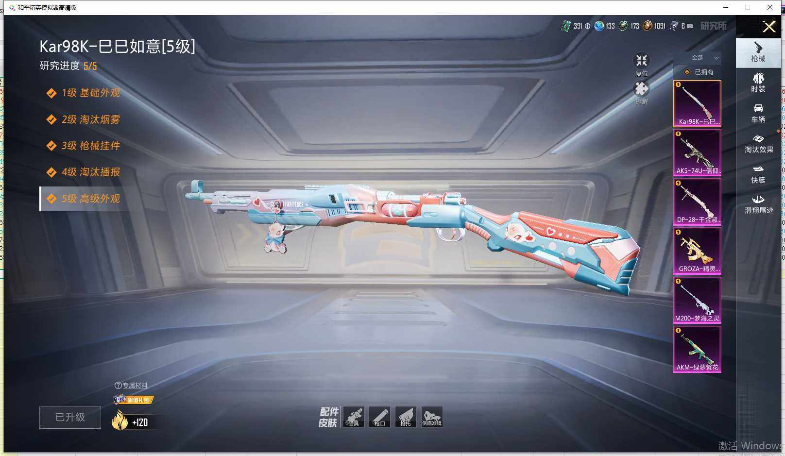 【粉色枪皮等级】:AKM-绿萝繁花(五级),GROZA-精灵之光(三级),AKS-74U-信仰神