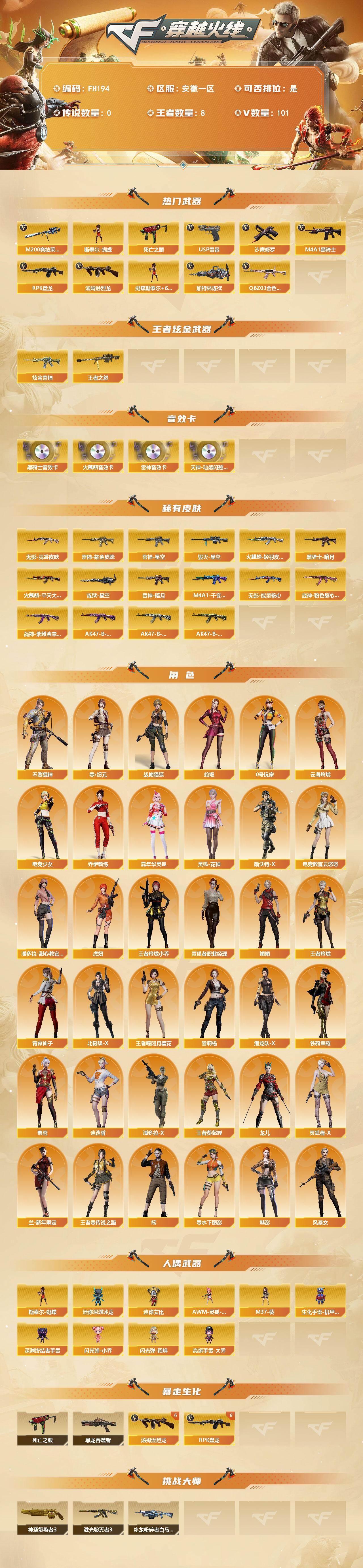 安徽一区-107V-8王者武器数-3炫金武器数【热门武器】:QBZ03-金色蔷薇*2,M200-竞技荣光,死亡之眼,M4A1-黑骑士*2,汤姆逊-烈龙*6,RPK-盘龙*6,加特林-炼狱*2,斯泰尔-蝴蝶,USP-雷暴,沙鹰-修罗*3【王者炫金武器】:王者之怒*2,炫金雷神*3【音效卡】:天神-动感闪耀 音效卡,AK47-火麒麟音效卡,M4A1-雷神音效卡*2,M4A1-黑骑士音效卡【皮肤】:雷神-暗月,雷神-星空,雷神-耀金皮肤,火麒麟-轻羽皮肤,火麒麟-平天大圣,毁灭-星空,M4A1-千变-