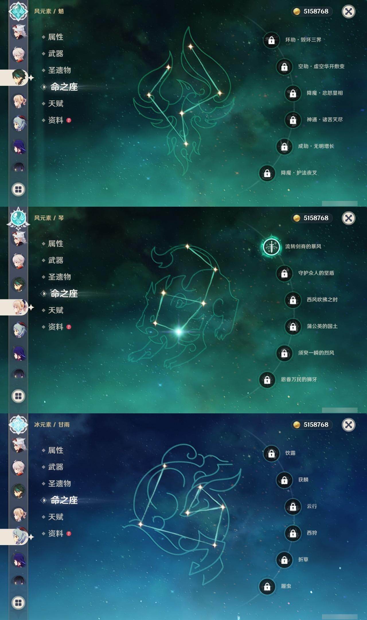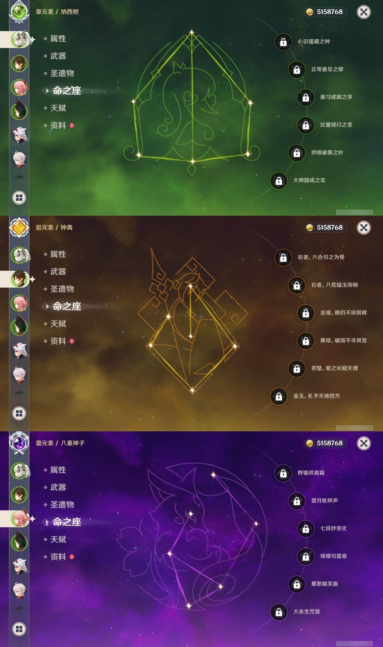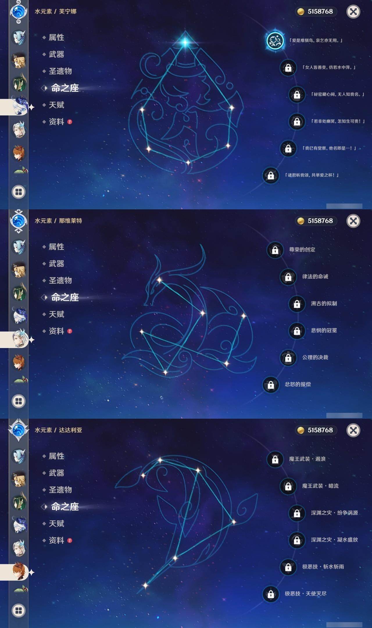 0命娜维娅,1命芙宁娜,0命那维莱特,0命纳西妲,满命提纳里,0命夜兰,0命神里绫人,0命八重神子,0命荒泷一斗,0命优菈,1命雷电将军,2命枫原万叶,0命钟离,1命胡桃,0命甘雨,0命魈,0命达达利亚,1命刻晴,3命七七,1命琴,1命莫娜,2命迪卢克,0命奈芙尔,精1苇海信标,精1飞雷之弦振,精1雾切之回光,精1护摩之杖,精1阿莫斯之弓,精1风鹰剑,精1狼的末路