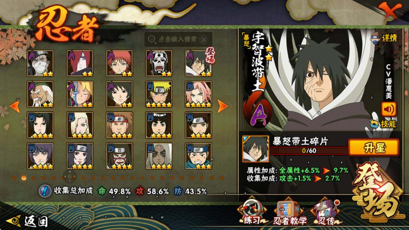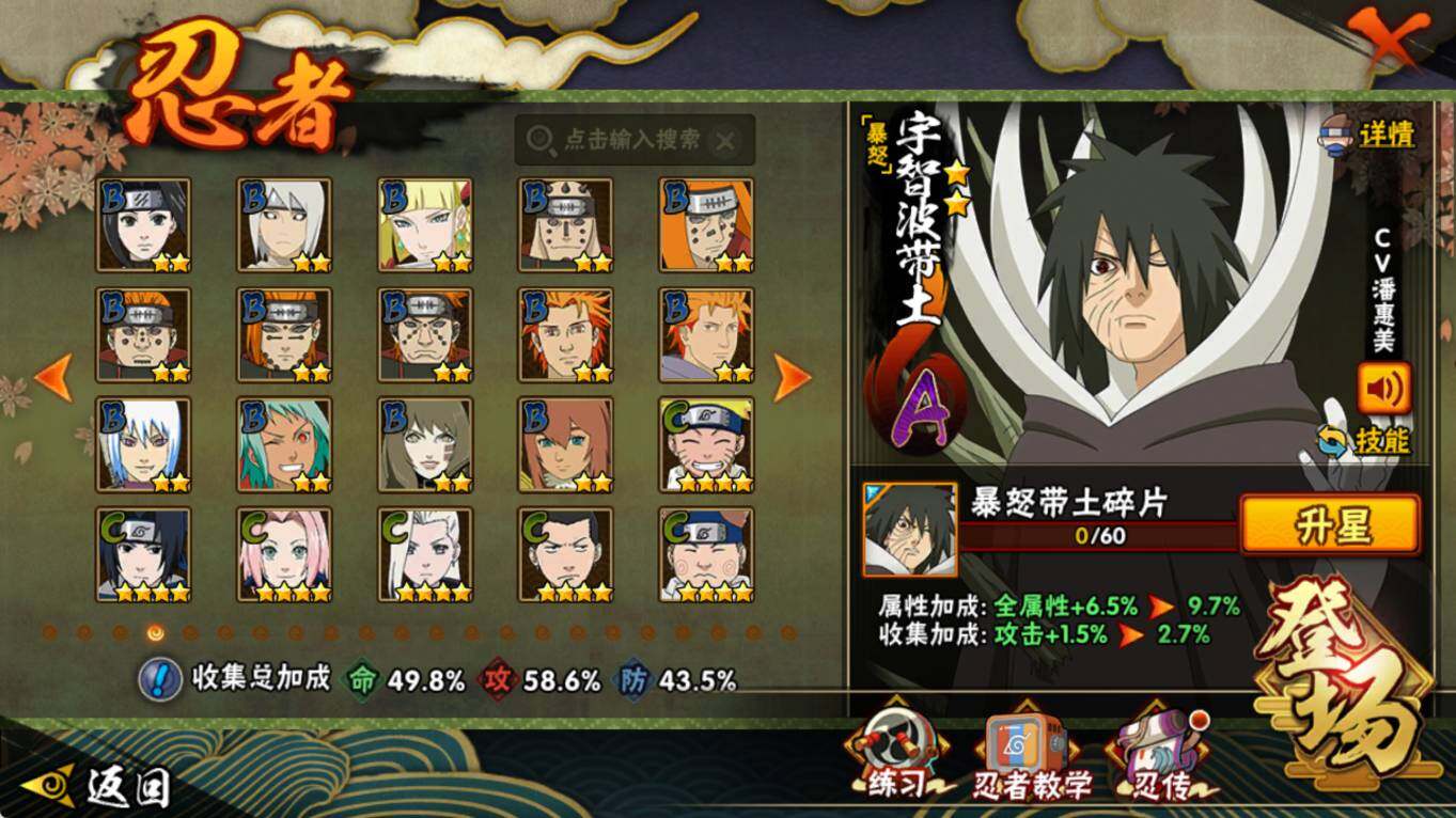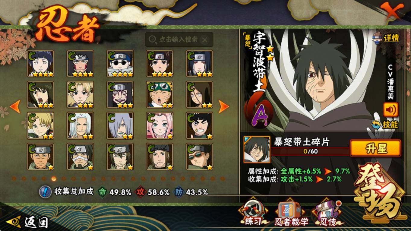 【S级忍者】:宇智波鼬「须佐能乎」(3星),自来也「舞之豪杰」(3星),波风水门(3星),佩恩「天道」(3星),宇智波佐助「永恒万花筒」(3星),漩涡鸣人·宇智波佐助(3星)