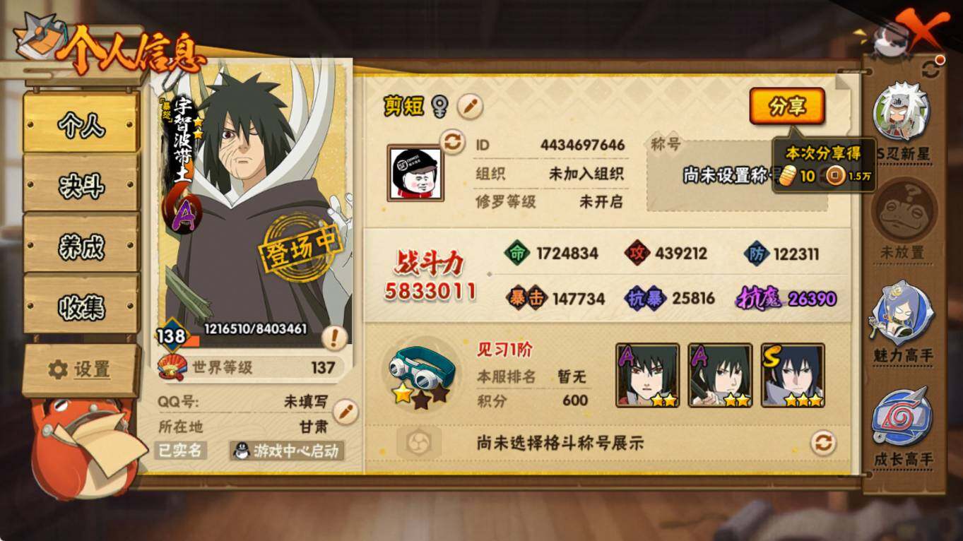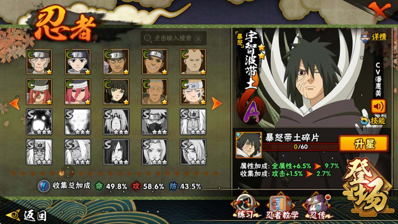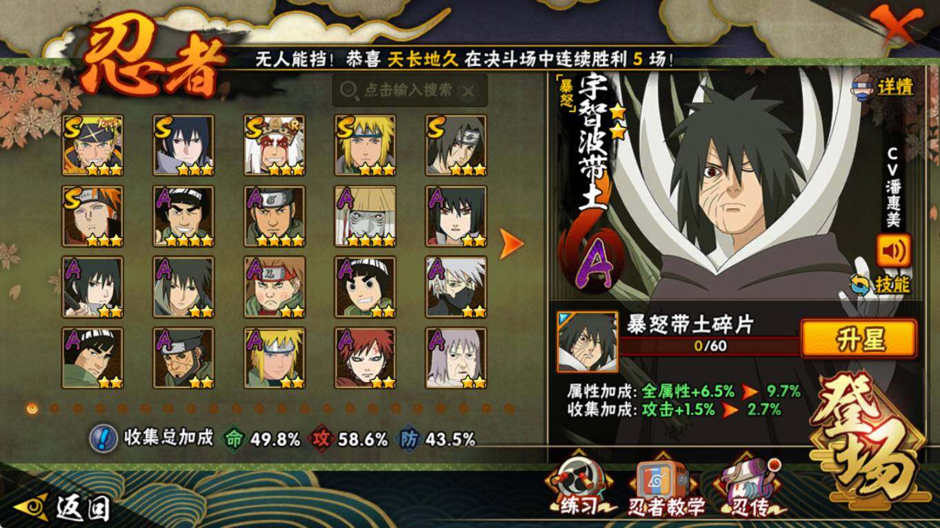 【S级忍者】:宇智波鼬「须佐能乎」(3星),自来也「舞之豪杰」(3星),波风水门(3星),佩恩「天道」(3星),宇智波佐助「永恒万花筒」(3星),漩涡鸣人·宇智波佐助(3星)