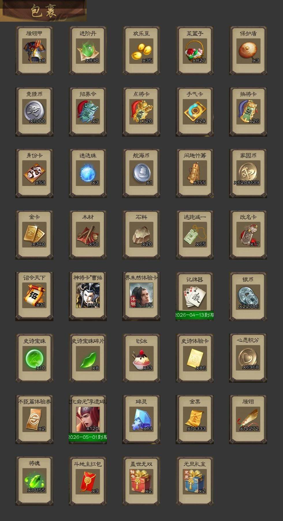 官阶:大将军;VIP等级:VIP10;史诗武将数量:66;动态皮肤数量:54;武将总数:431;史诗宝珠数量:10;将魂数量:10155;神将:9;魏国史诗武将:22;蜀国史诗武将:13;吴国史诗武将:10;群史诗武将:22