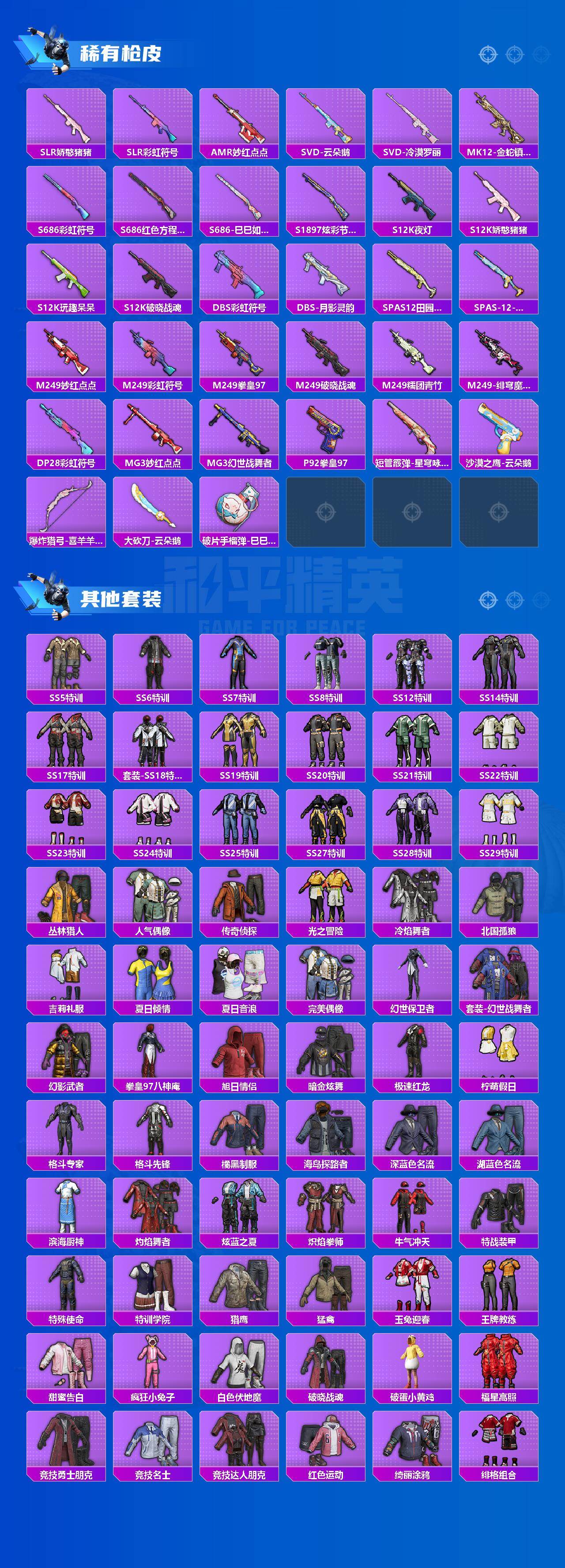 【粉色枪皮等级】:AUG-暖羊咩咩(五级),Kar98K-巳巳如意(五级),Mk14-福马献瑞(五级),DP-28-豹影疾电(五级)