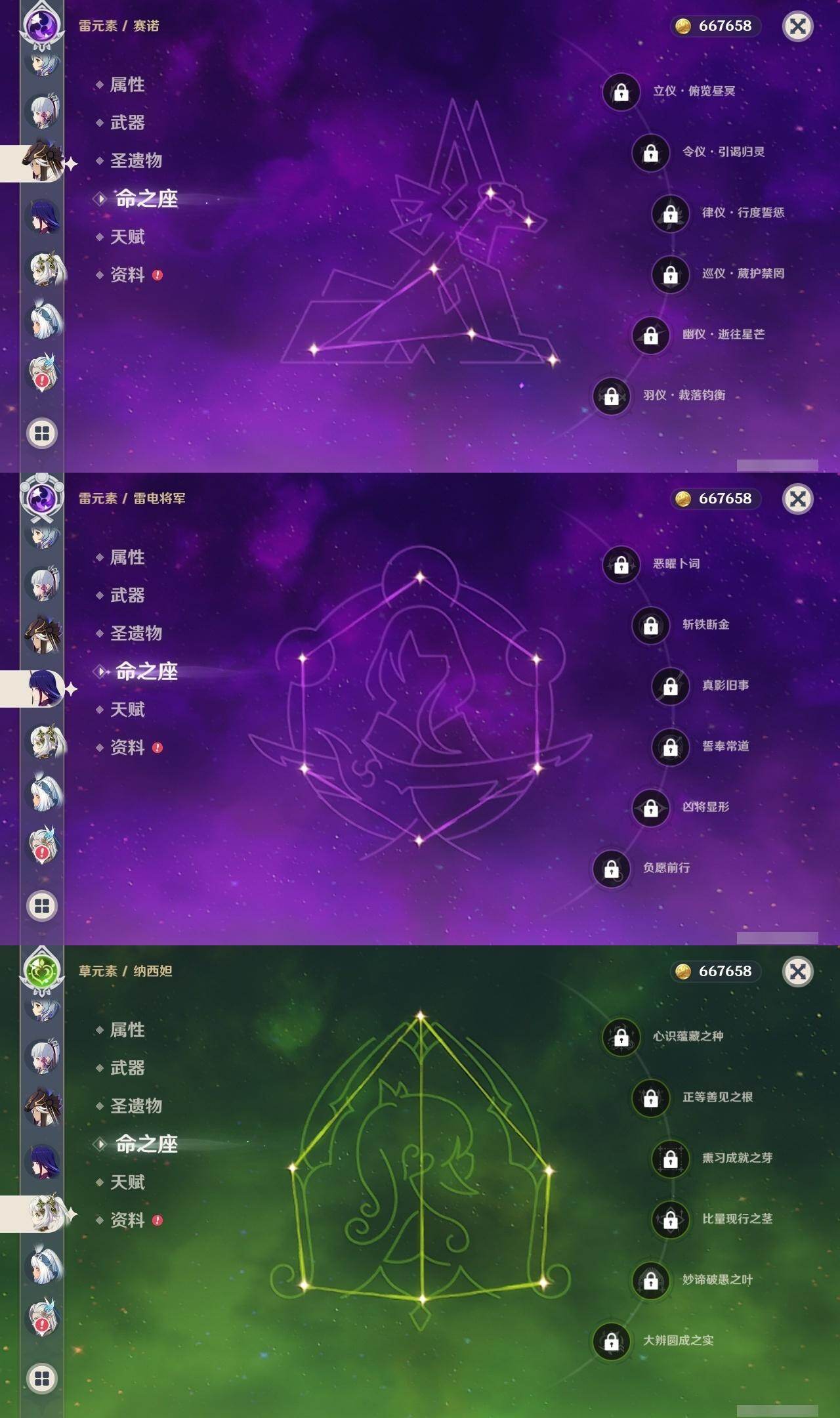 0命那维莱特,0命迪希雅,0命纳西妲,0命赛诺,0命提纳里,0命申鹤,0命优菈,0命雷电将军,0命枫原万叶,0命神里绫华,0命钟离,0命甘雨,0命魈,1命刻晴,3命七七,1命莫娜,0命迪卢克,0命玛拉妮,0命玛薇卡,0命丝柯克,精1息灾,精1薙草之稻光,精1雾切之回光,精1四风原典,精1天空之脊,精1阿莫斯之弓,精1天空之刃,精1天空之傲,精1山王长牙