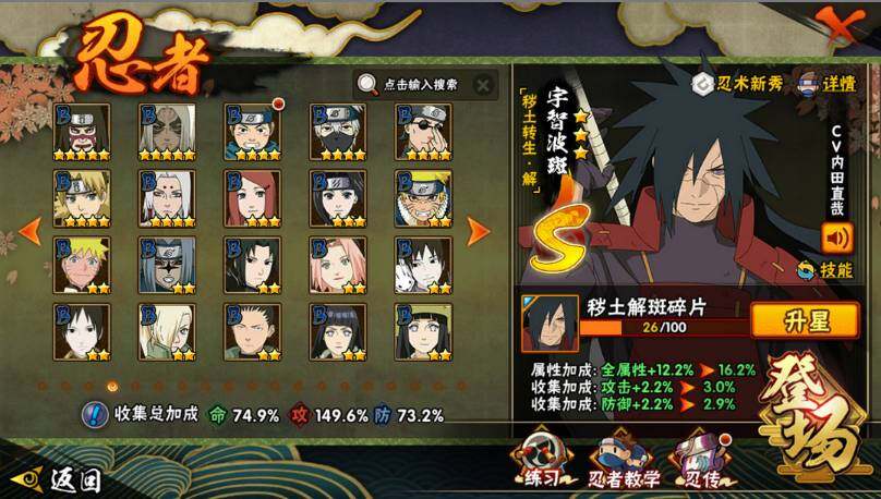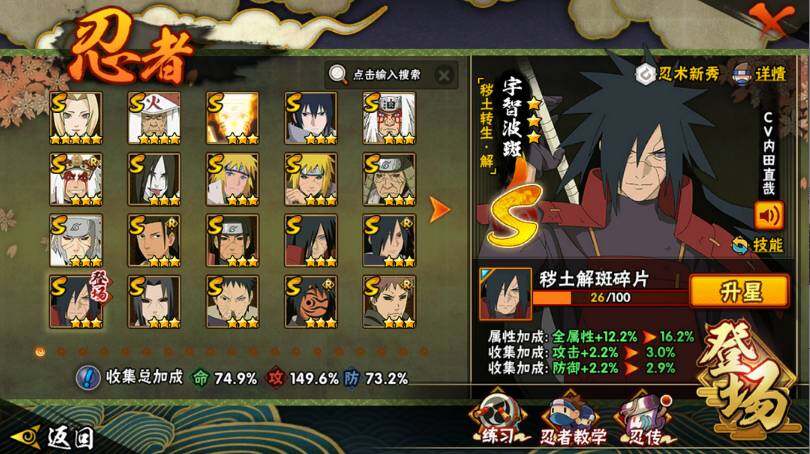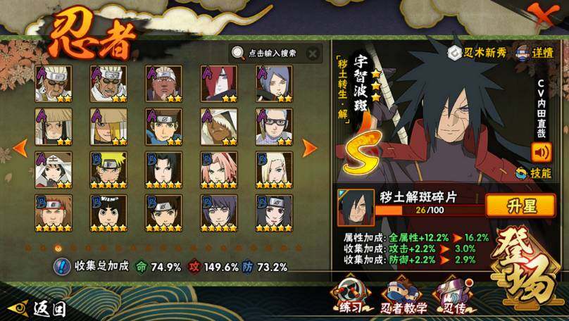 【S级忍者】:半藏「秽土转生」(3星),猿飞日斩「秽土转生」(3星),波风水门「秽土转生」(3星),千手扉间「秽土转生」(3星),千手柱间「秽土转生」(3星),宇智波鼬「秽土转生」(3星),宇智波斑「秽土转生」(3星),宇智波斑「秽土转生·解」(3星),宇智波带土「忍界大战」(3星),宇智波斑「木叶创立」(3星),千手柱间「木叶创立」(3星),罗砂「四代目风影」(3星),大野木「三代目土影」(3星),自来也「仙人模式」(3星),自来也「舞之豪杰」(3星),大蛇丸(