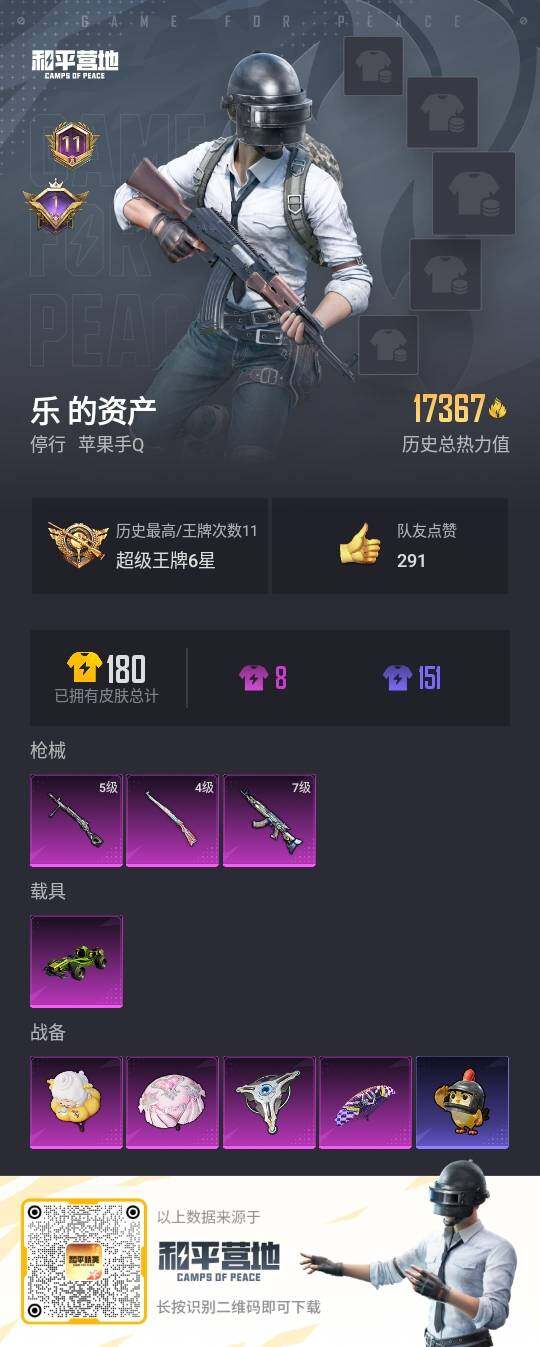 苹果 手Q-0粉装-3特效枪-1载具-1粉色飞行器-17367热力值-11王牌印记-37套装-50枪皮【粉色枪皮等级】:M762-激战未来(七级),Kar98K-巳巳如意(四级),DP-28-豹影疾电(五级)【粉色载具】:合金龙骨(绿)【粉色枪皮】:M762-激战未来,Kar98K-巳巳如意,DP-28-豹影疾电【粉色飞行器】:激战未来飞行器