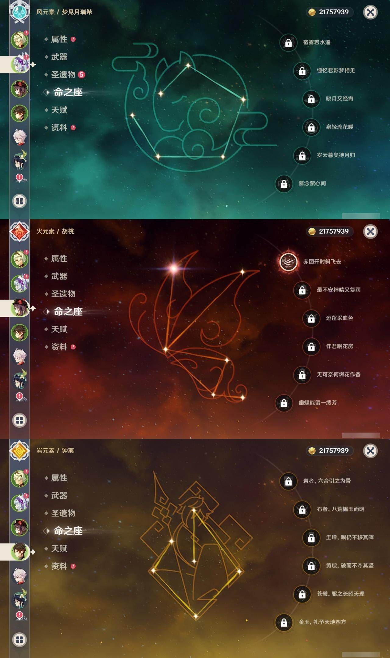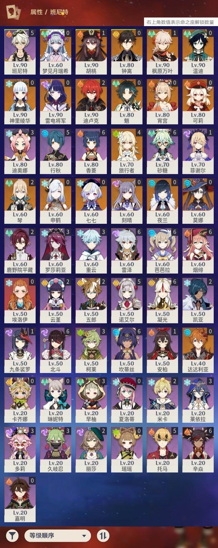 0命夜兰,0命申鹤,0命雷电将军,1命枫原万叶,0命神里绫华,0命钟离,1命胡桃,0命魈,0命宵宫,0命温迪,0命可莉,0命达达利亚,0命刻晴,0命七七,2命琴,0命莫娜,2命迪卢克,0命梦见月瑞希,精1裁叶萃光,精1息灾,精1薙草之稻光,精1天空之翼,精1天空之刃,精1天空之卷,精1冲浪时光