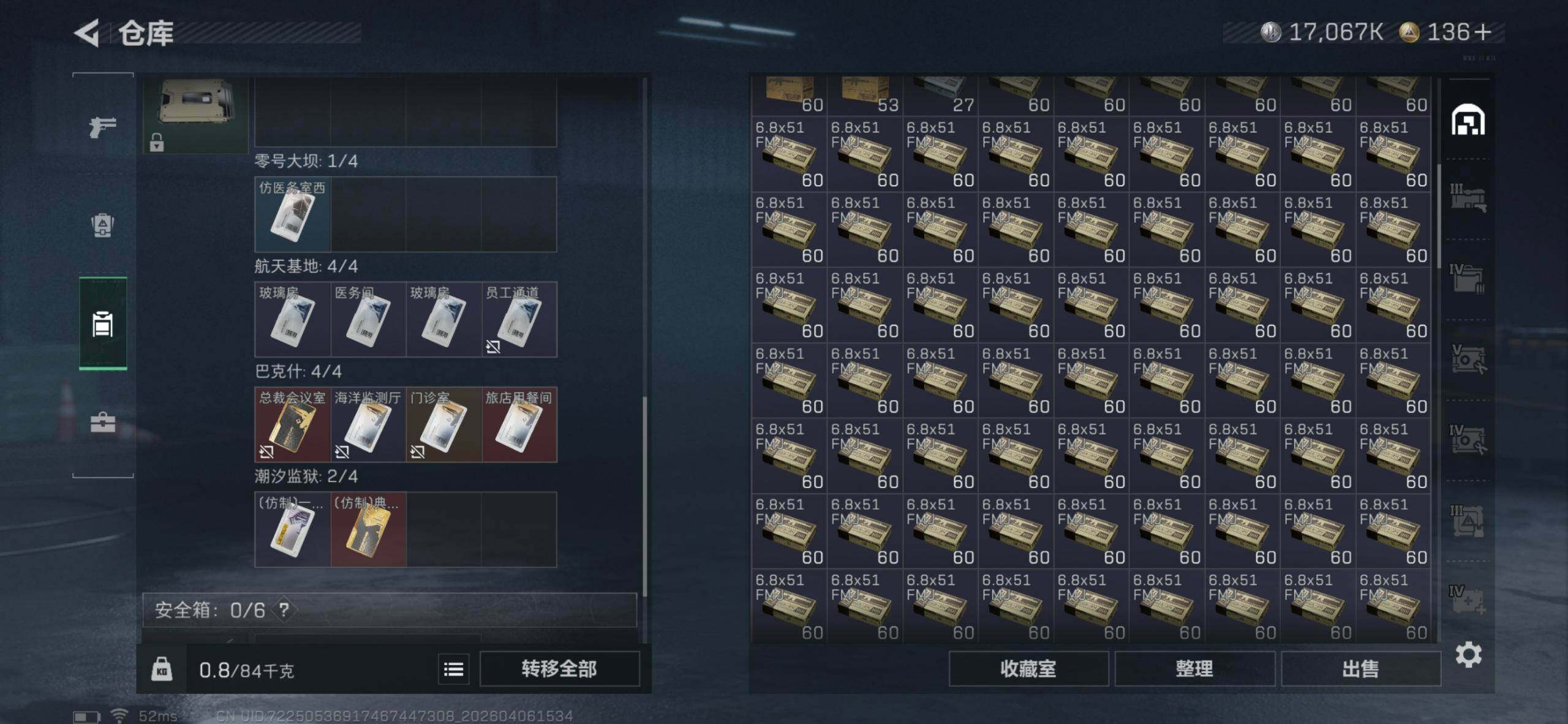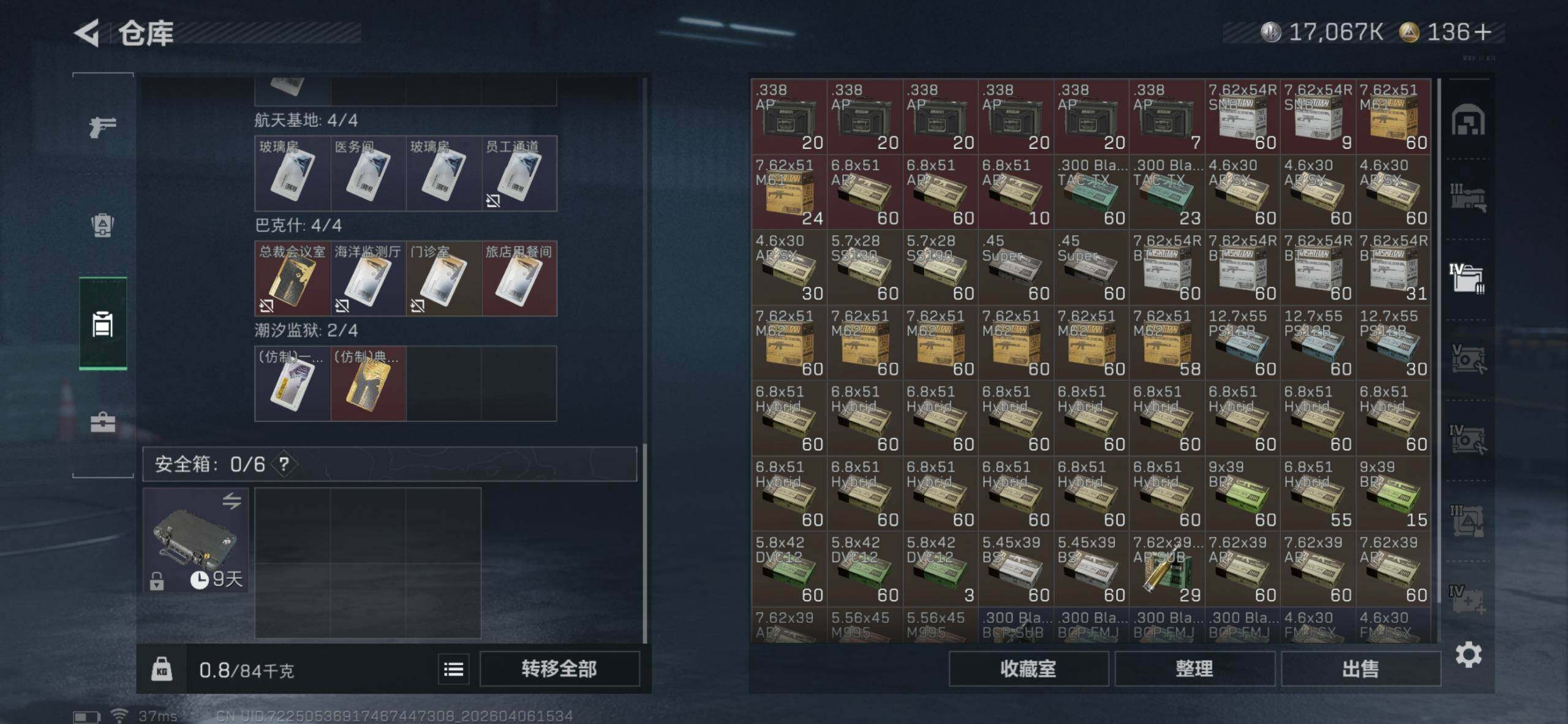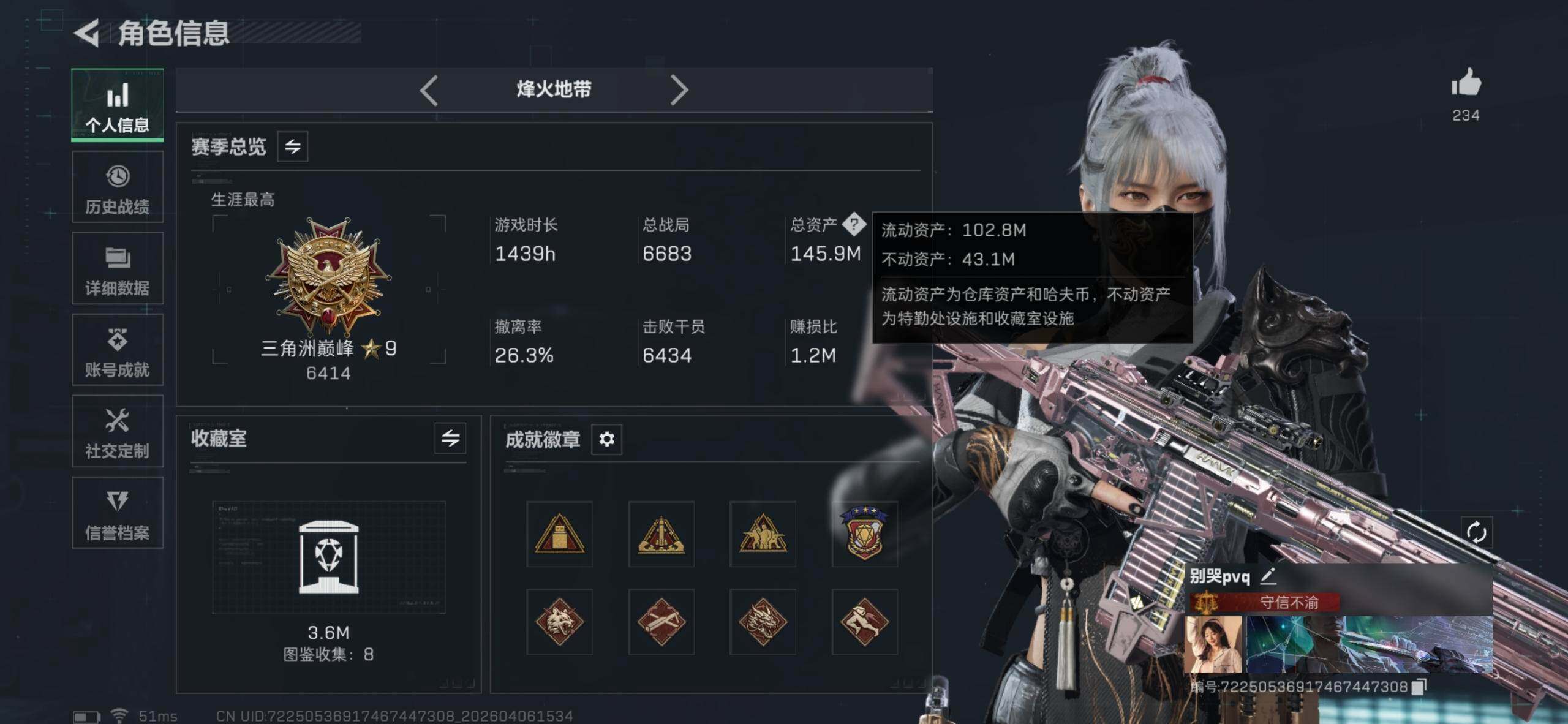 145.9M/107发AW子弹/北极星影锋绝版刀皮/红狼玫瑰/电锯惊魂/飞虎铁面壮志凌云/水墨云图/无名蜂医深蓝露娜赛季金皮/街头之王/不羁人生/粉色M7(优C)/3S牛角威龙/总资产-17067k哈夫币-60烽火等级-黑鹰-34战场等级-列兵