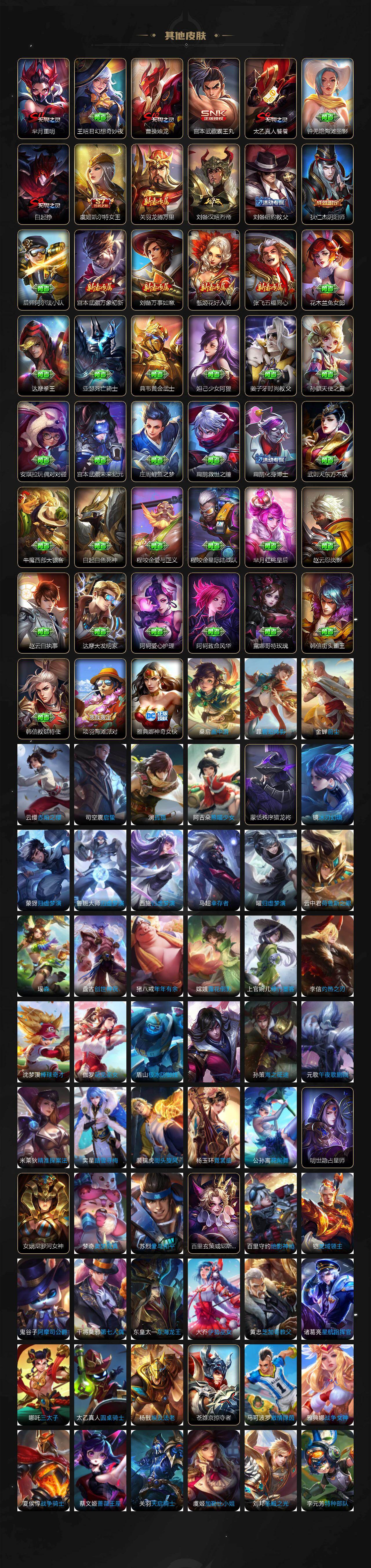 【英雄全皮】:刘禅全皮,露娜全皮,姜子牙全皮,刘邦全皮,孙权全皮,娜可露露全皮,橘右京全皮,刘备全皮,苍全皮,鬼谷子全皮,黄忠全皮,苏烈全皮,百里守约全皮,弈星全皮,公孙离全皮,沈梦溪全皮,明世隐全皮,狂铁