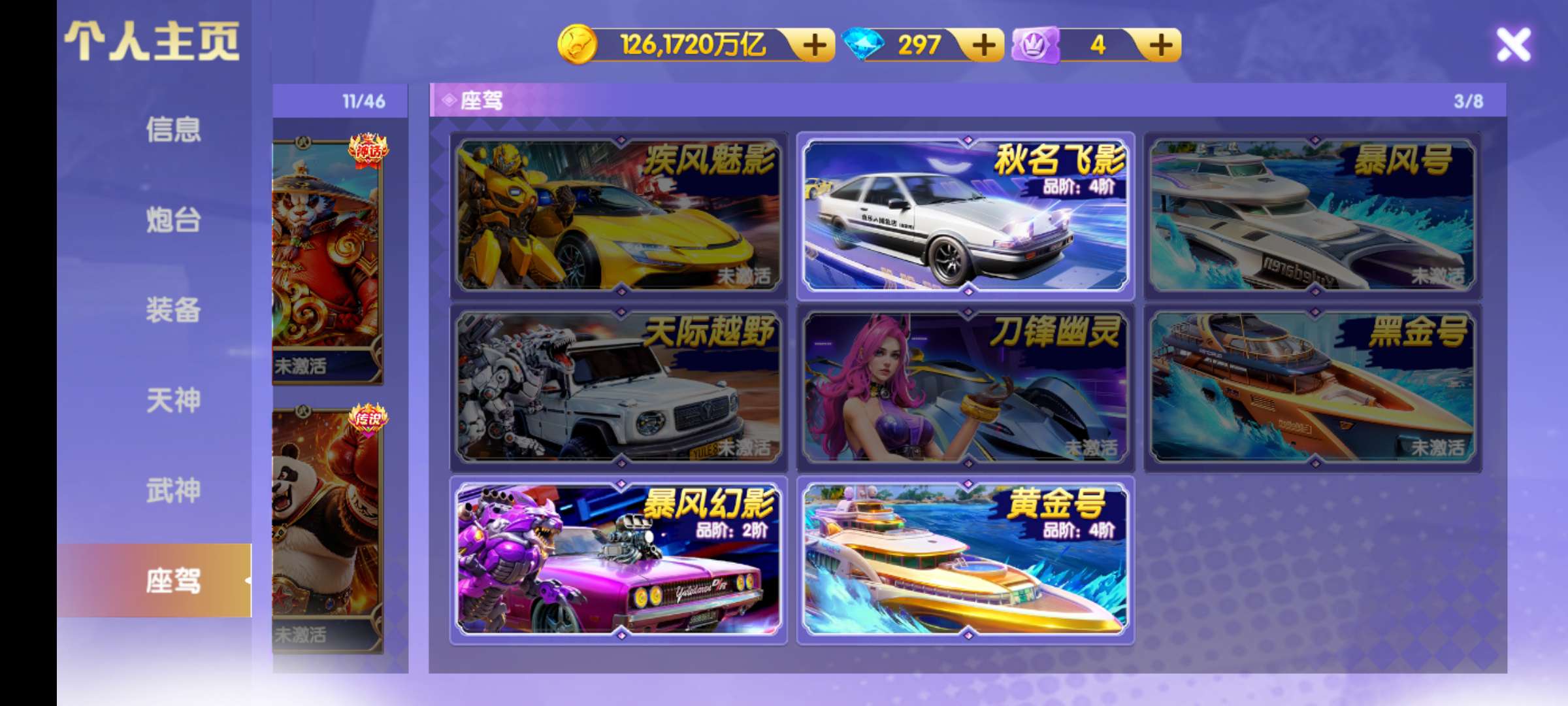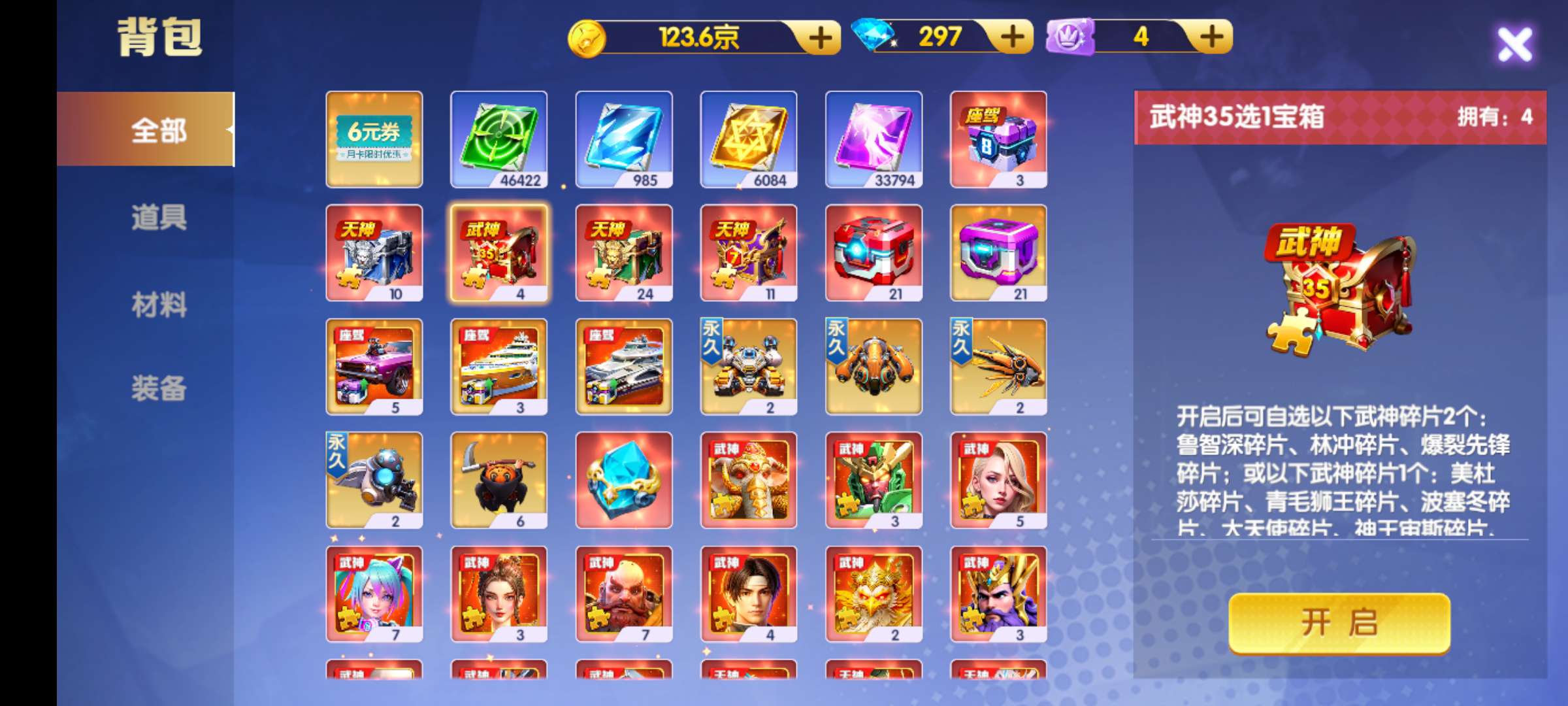 124京,神装,随时可以升2万炮,82开头可以换绑,一堆材料1200连击,差点6星天王