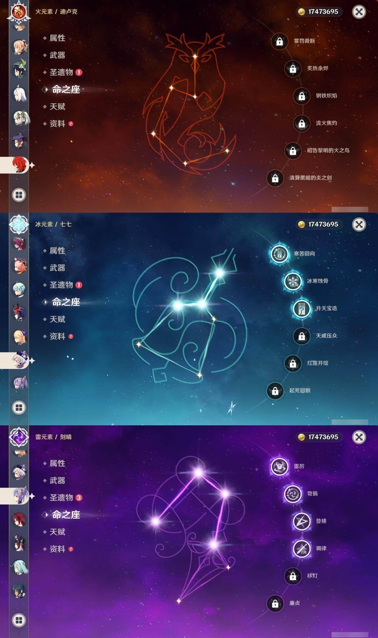 0命迪希雅,0命流浪者,0命纳西妲,0命夜兰,0命申鹤,0命雷电将军,0命枫原万叶,0命神里绫华,0命钟离,0命胡桃,0命甘雨,0命魈,0命温迪,0命达达利亚,4命刻晴,3命七七,2命琴,1命莫娜,0命迪卢克,精1若水,精1波乱月白经津,精1冬极白星,精1磐岩结绿,精1四风原典,精1天空之脊,精1天空之翼,精1风鹰剑,精1天空之傲