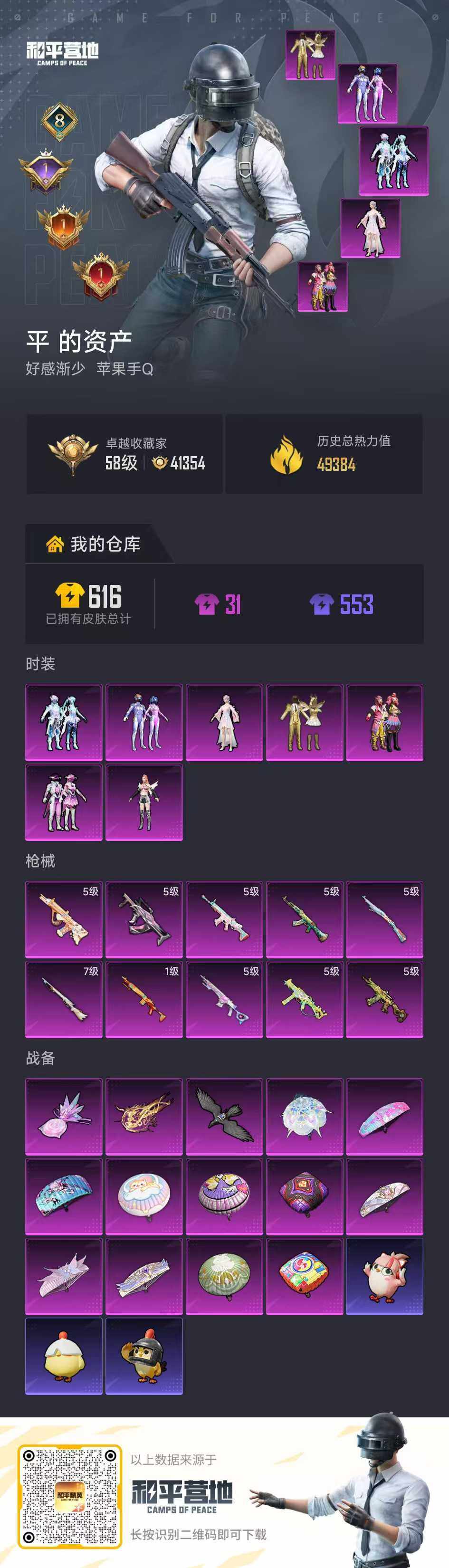 实名: 不可修改 时装数: 127 枪械数: 158 战备数: 113 热门装扮: 梦幻火箭(新101),金属狂野,鹰眼刺客,缤纷油彩,都市猎人,激萌罗小黑,动感兔斯基,派对舞王,水仙星,室女星神,烟云彩露,幻彩电音 稀有枪皮: M24莲影清波,AKM绿萝繁花,SCAR-L-锦绣绵绵,GROZA-镜光银凌,Kar98K-巳巳如意,AUG-暖羊咩咩,MK14-甜梦熊击