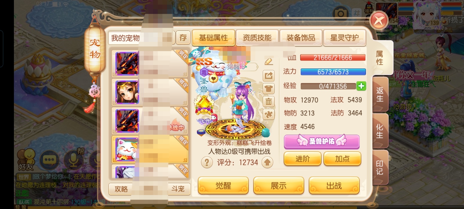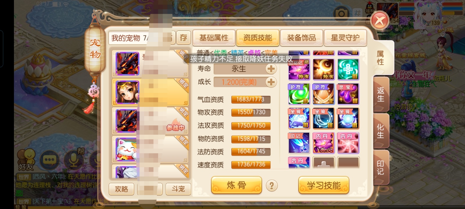 有大房子,猫满阶没奥义,蝴蝶有奥义,有破天、精怪、金辉奇谭翅膀,仓库资源多宠物觉醒了,宠物竞技拿金锭