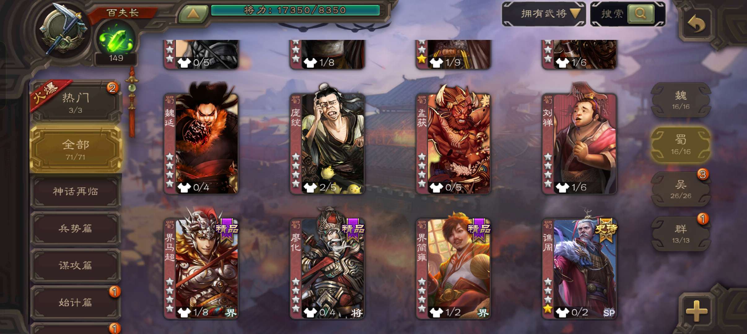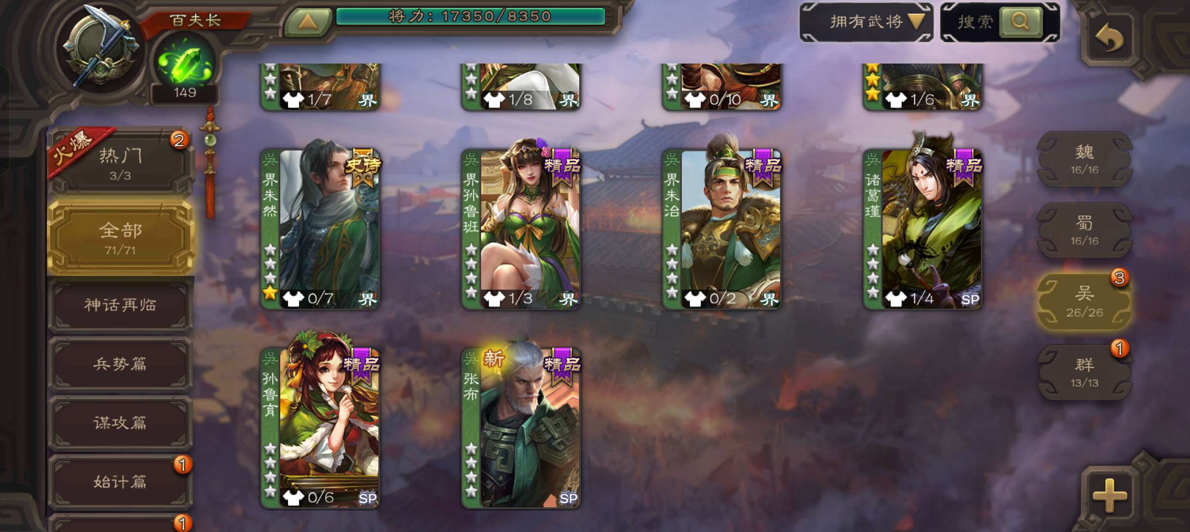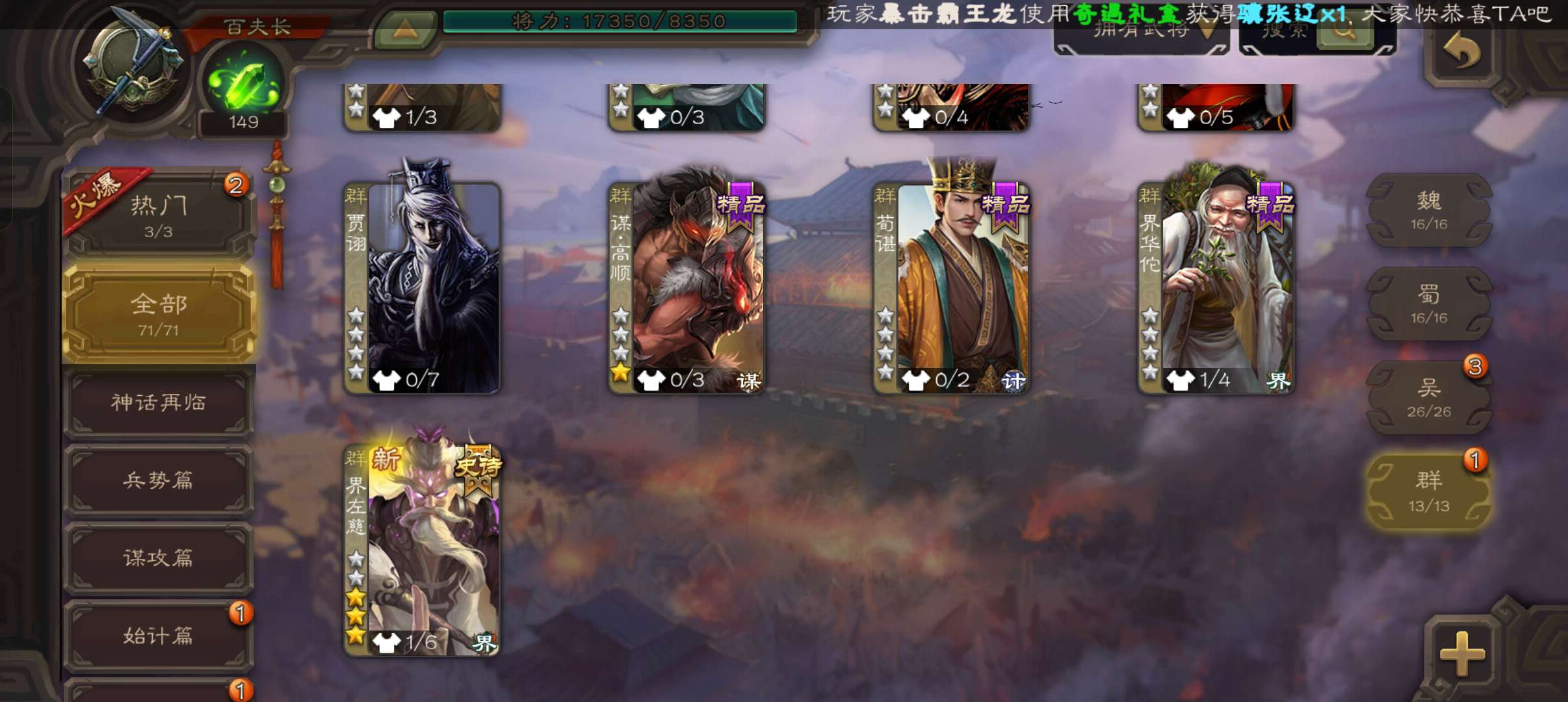 71将百夫长,6万豆,大宝界徐盛真动态界左慈界朱然谯周4史诗,谋韩当桥公崔琰,131招募令