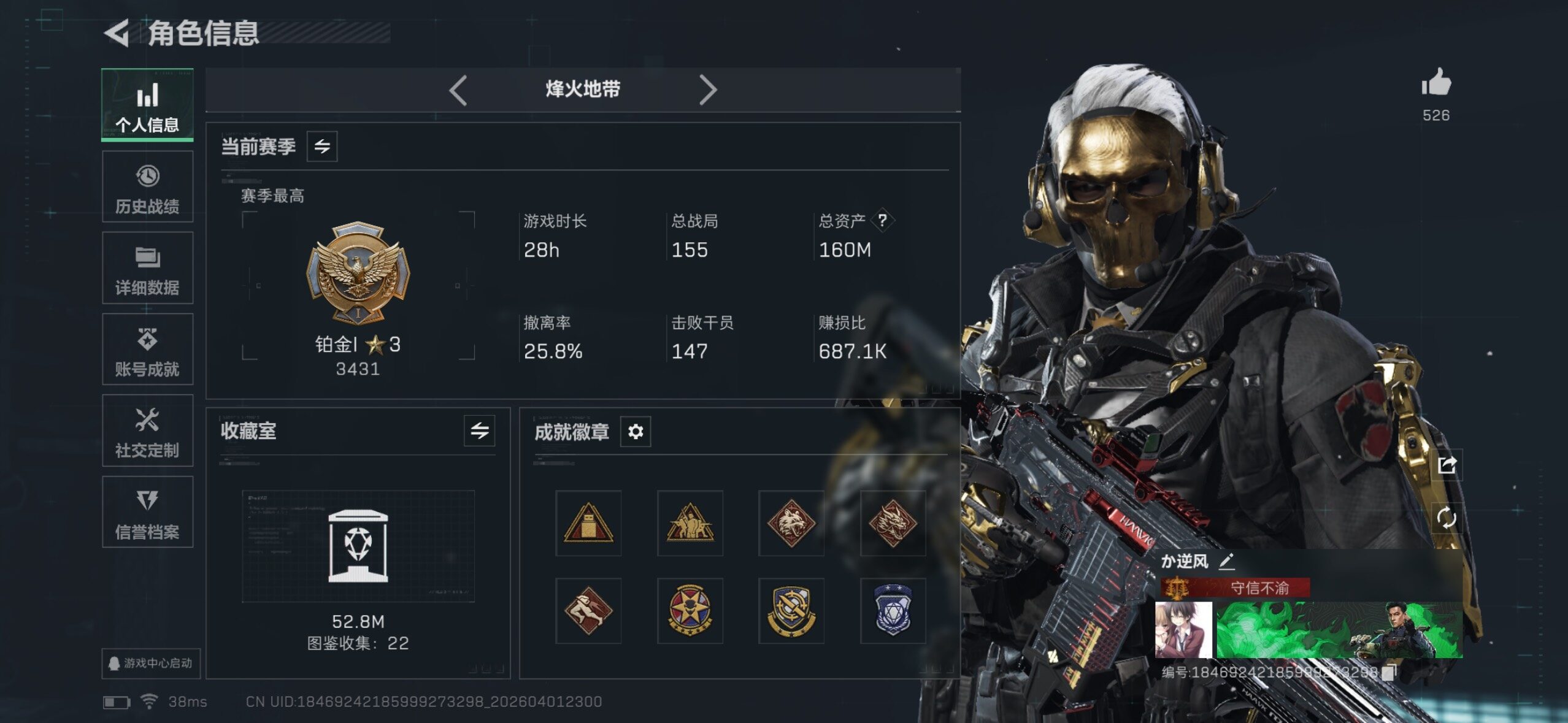 159m总资产-1k哈夫币-60烽火等级-铂金-33战场等级-上等兵