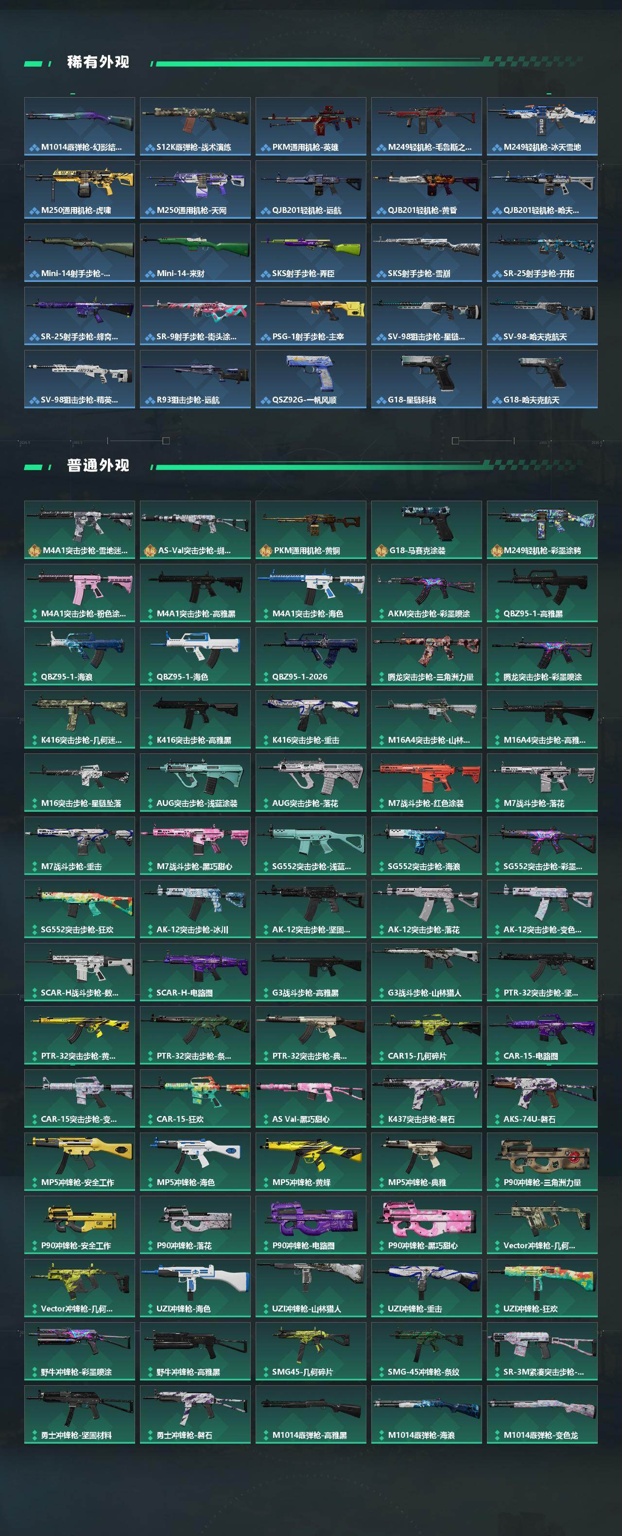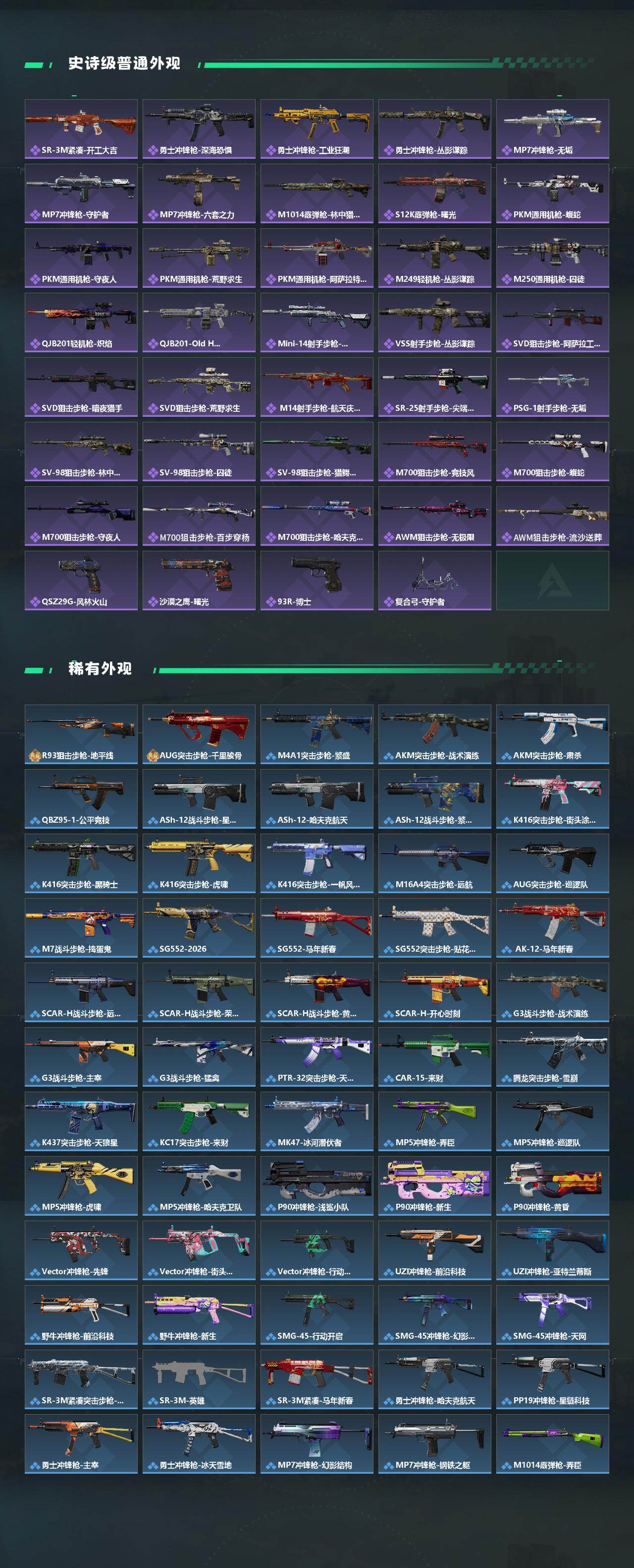 【传说外观】:M4A1突击步枪-蚀金玫瑰,M4A1突击步枪-阿米娅,AKM突击步枪-锦绣,ASh-12战