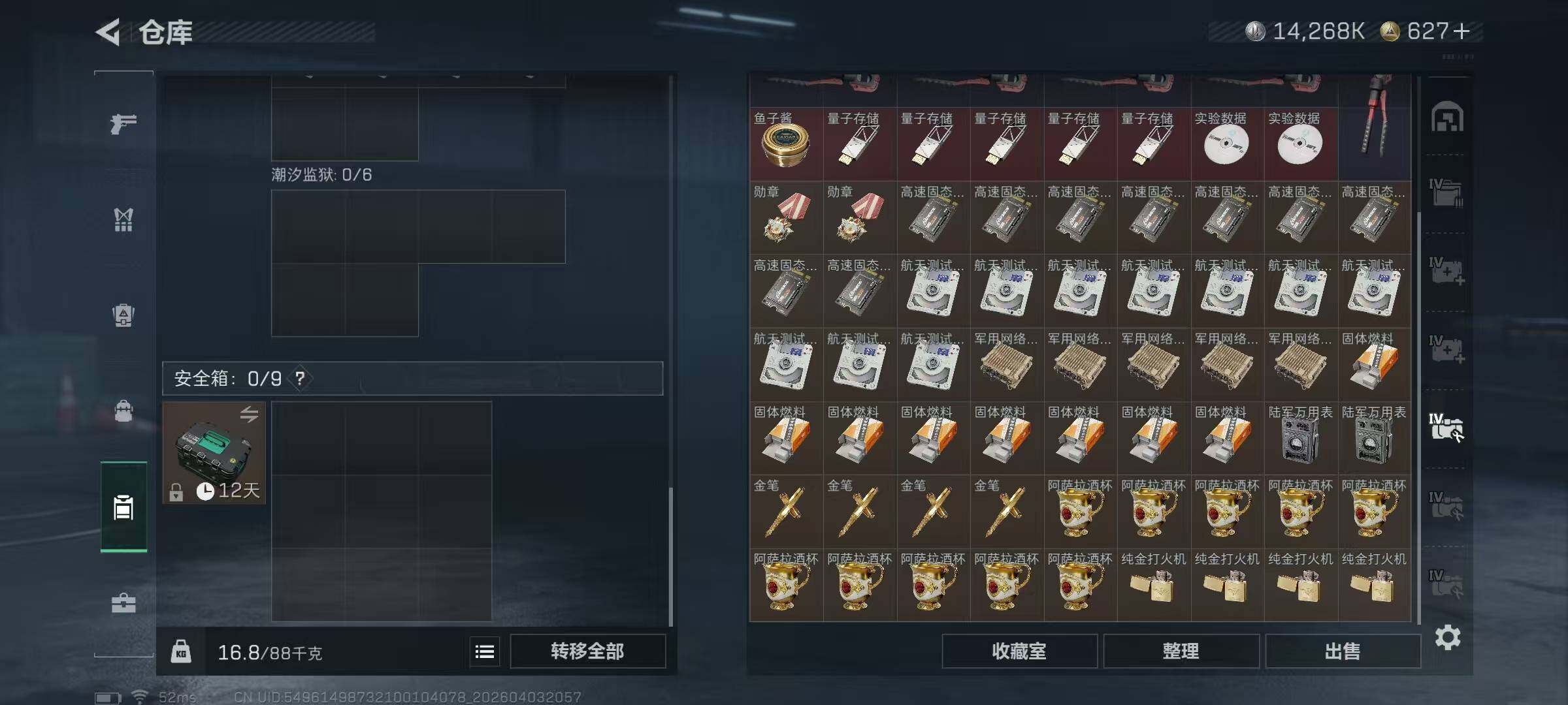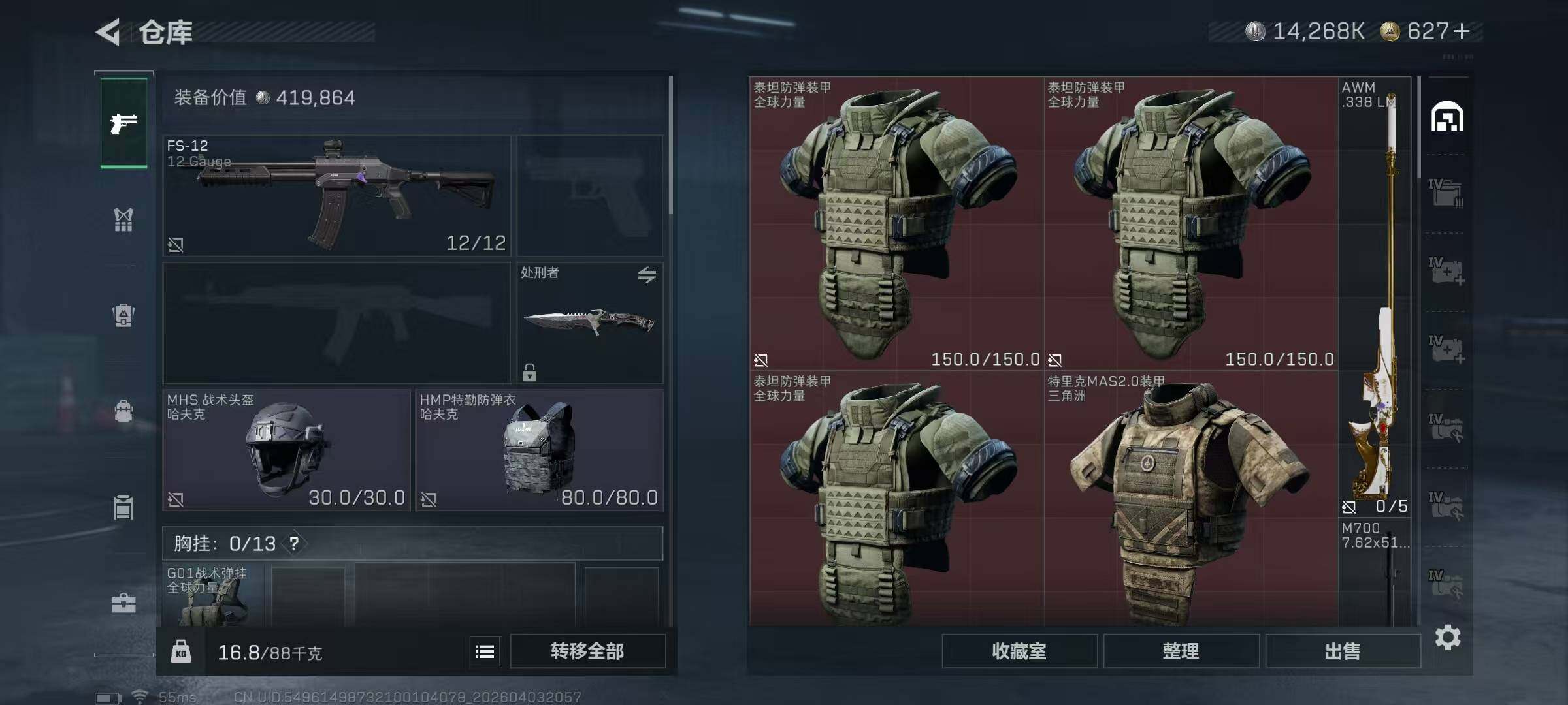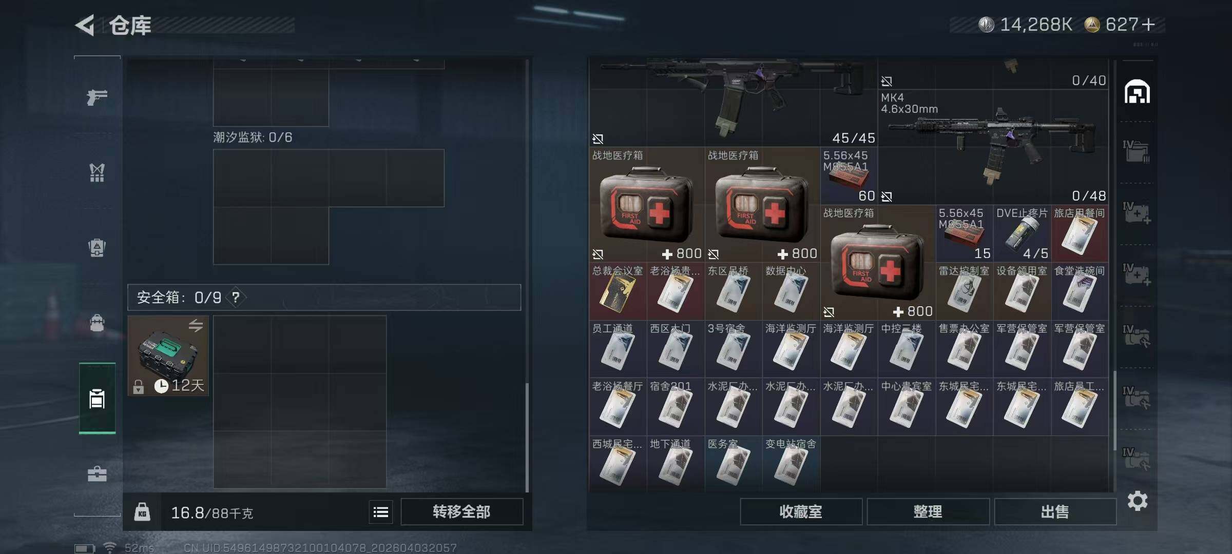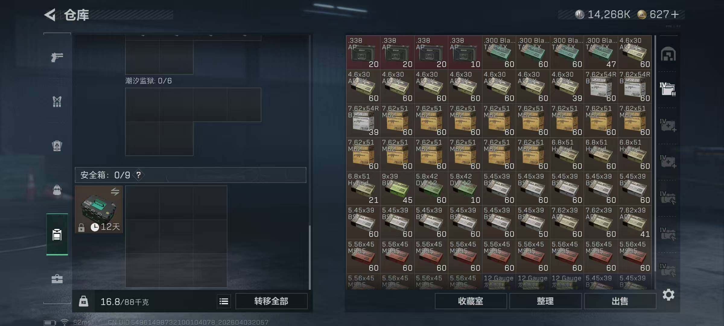 【SJ1648】【无封禁满体满负带S8顶级3X3】60级/总资210M/流资174M/627点卷/刀皮(处刑者)蛊(不羁人生)/8级仓库7级体力7级负重1级潜水/70发AW子弹