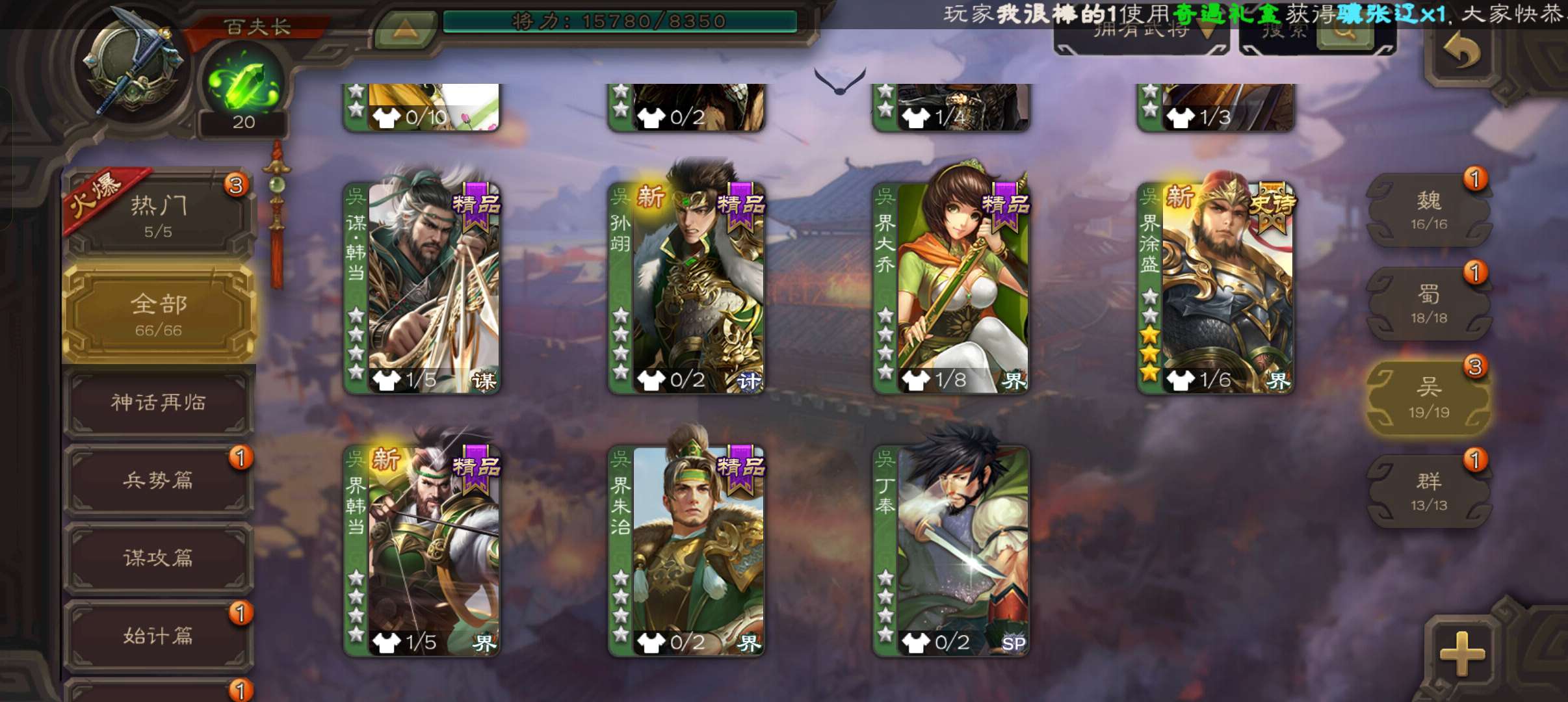 66将百夫长,6万豆,大宝界徐盛真动态界左慈金皮谯周界黄忠4史诗,甘夫人谋韩当骥李典,123招募令