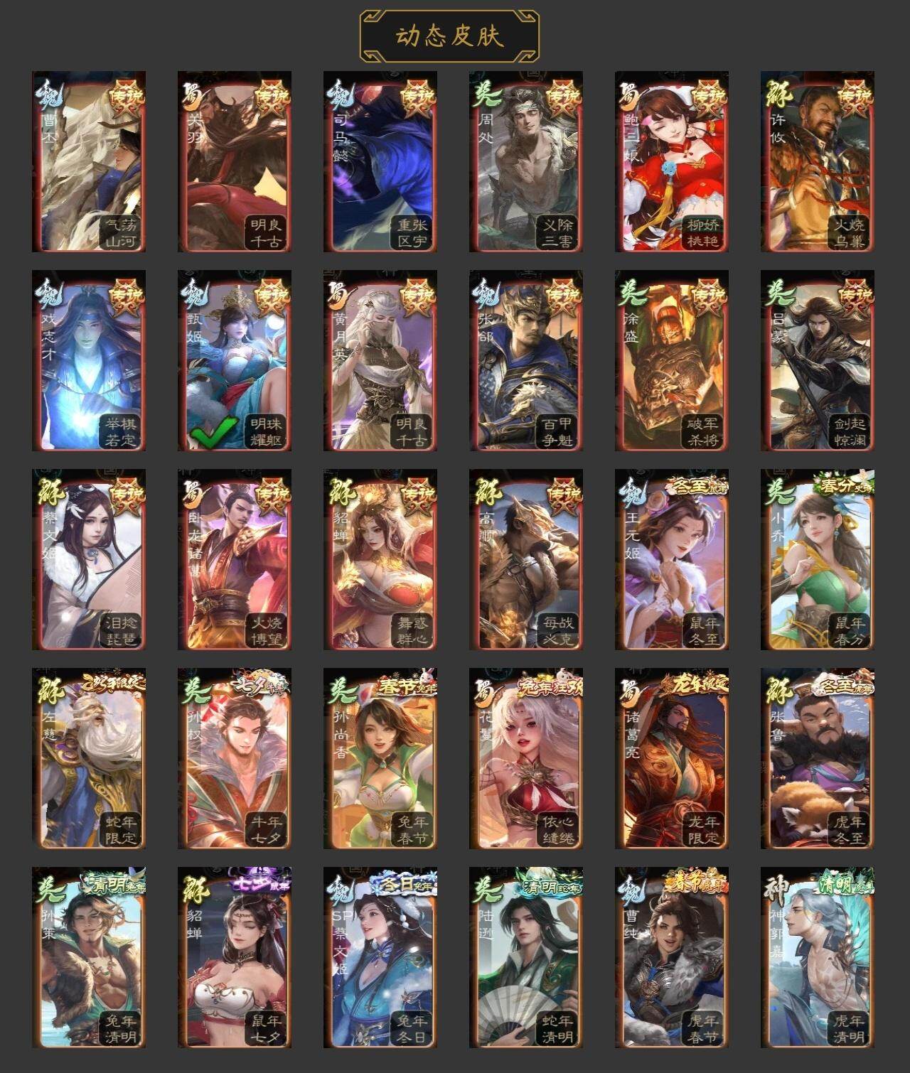 神吕布,神赵云,神张辽,神诸葛亮,星周不疑,谋曹操,杨修,王元姬,界于禁,界曹真,郝昭,陈琳,曹纯,戏志才,蒋干,程昱,谋诸葛亮,谋赵云,谋马超,诸葛瞻,周群,沙摩柯,花鬘,谋孙策,骆