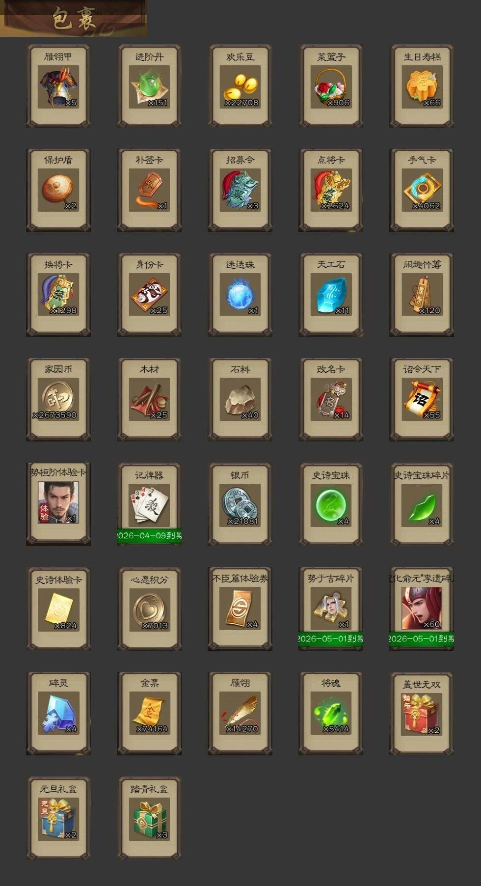 官阶:大将军;VIP等级:VIP8;史诗武将数量:36;动态皮肤数量:29;武将总数:357;史诗宝珠数量:4;将魂数量:5414;神将:4;魏国史诗武将:14;蜀国史诗武将:7;吴国史诗武将:5;群史诗武将:9
