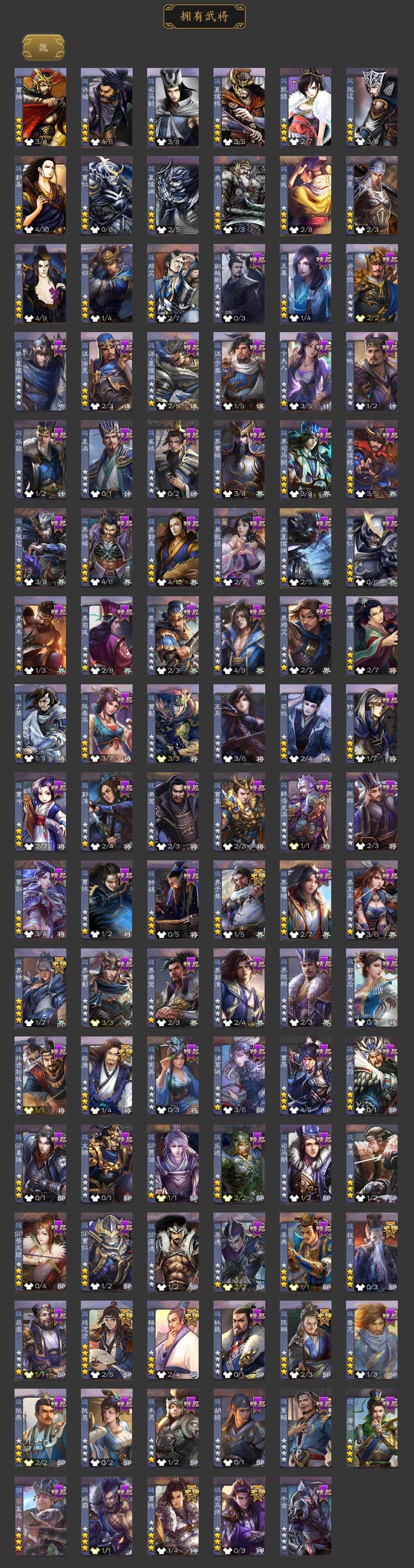 神曹操,神吕布,神赵云,神陆逊,神刘备,神张辽,神太史慈,神诸葛亮,杨修,司马师,界钟会,界于禁,嵇康,陈琳,曹纯,戏志才,程昱,关索,马云騄,谋赵云,诸葛瞻,赵襄,张星彩,王平