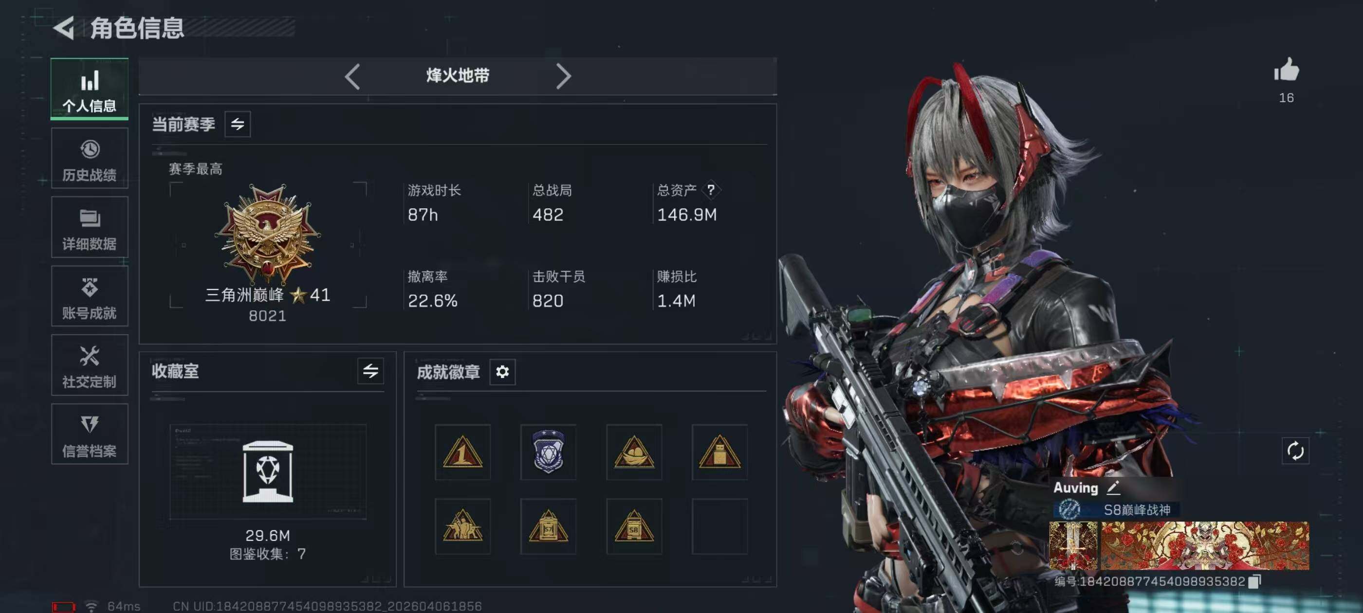 146m总资产-41k哈夫币-60烽火等级-三角洲巅峰-20战场等级-上等兵