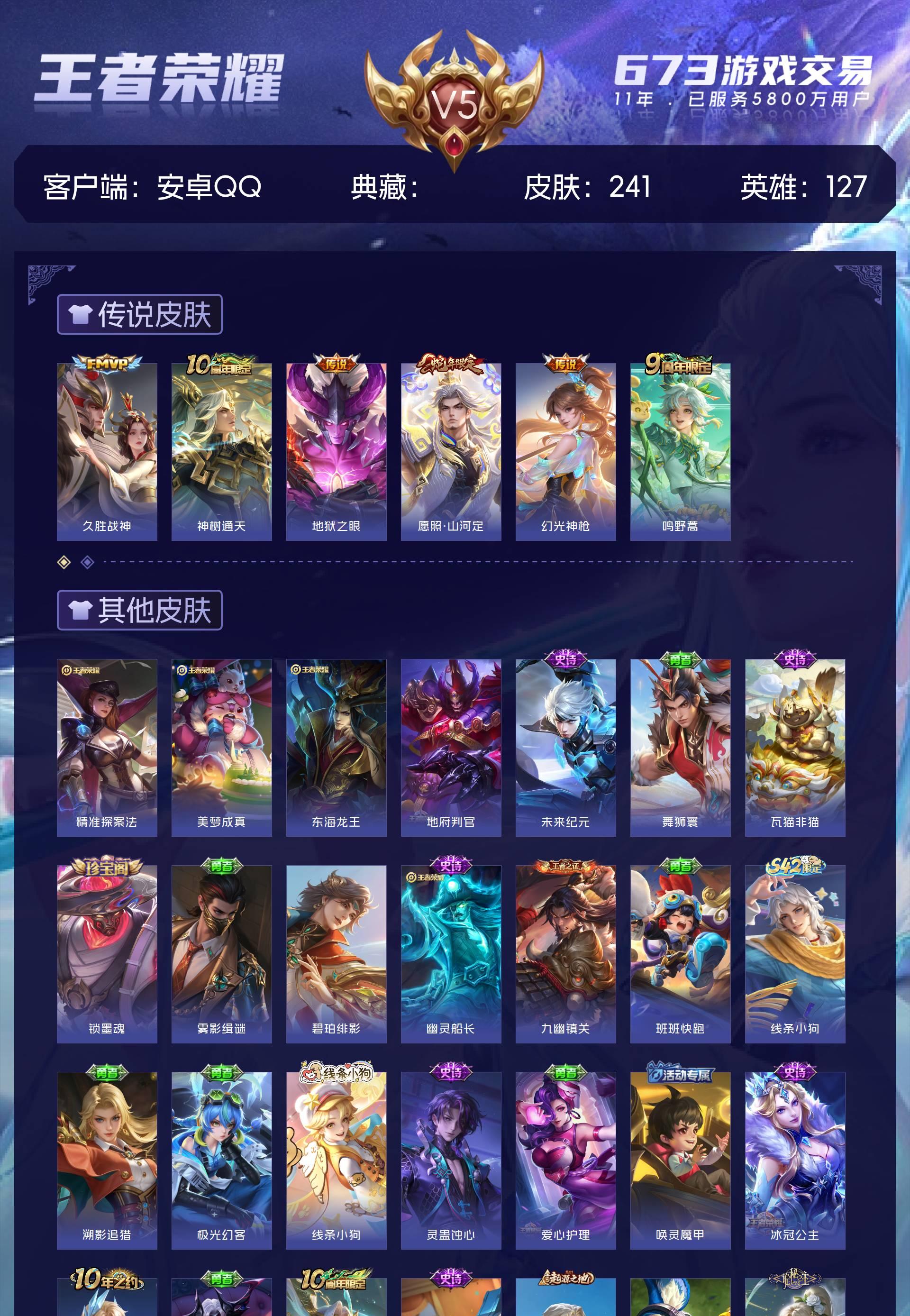 V5 皮肤241 英雄127 至尊星耀 星传说1 传说6