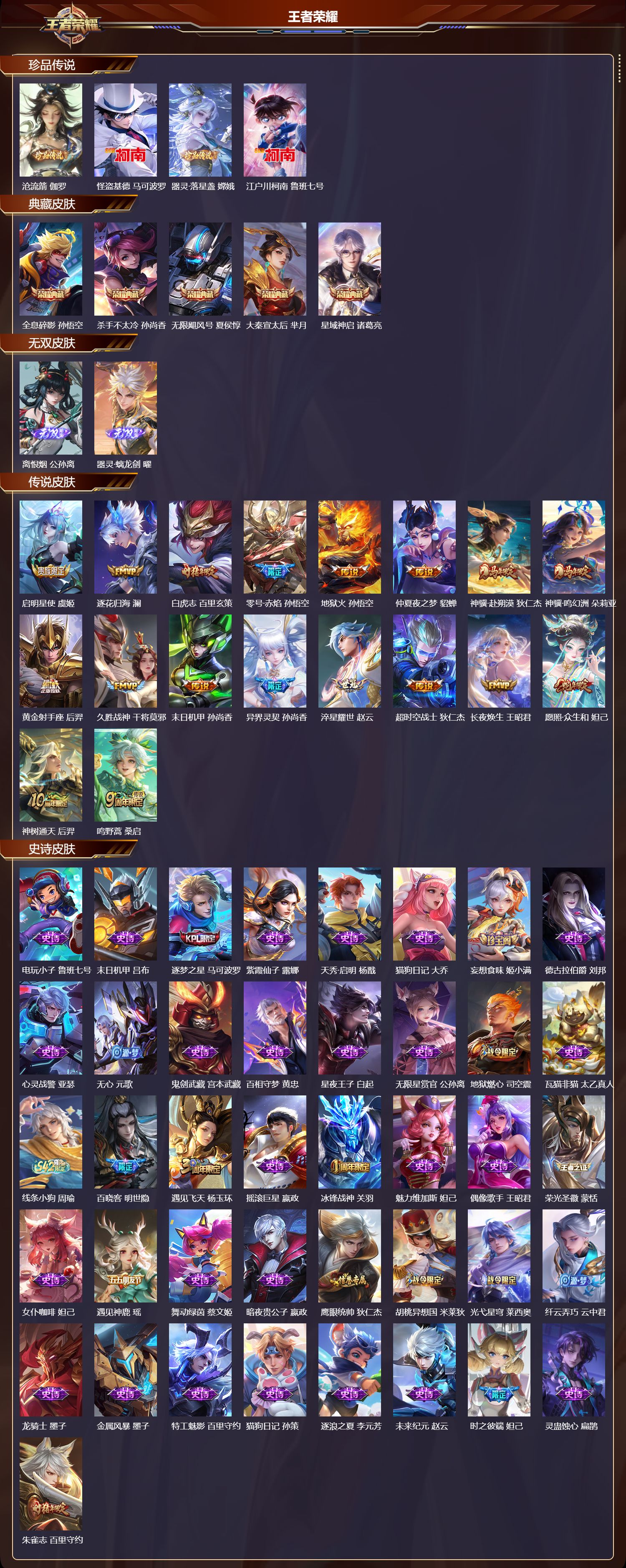 安卓QQ/无双王者/313皮肤/128英雄/5典藏/0珍品无双/2无双/4珍品传说/18传说/78史诗/9稀有英雄【4 珍品传说】沧流箭 伽罗,怪盗基德 马可波罗,器灵·落星盏 嫦娥,江户川柯南 鲁班七号,【5 典藏皮肤】全息碎影 孙悟空,杀手不太冷 孙尚香,无限飓风号 夏侯惇,大秦宣太后 芈月,星域神启 诸葛亮,【2 无双皮肤】离恨烟 公孙离,器灵·螭龙剑 曜,【18 传说皮肤】启明星使 虞姬,