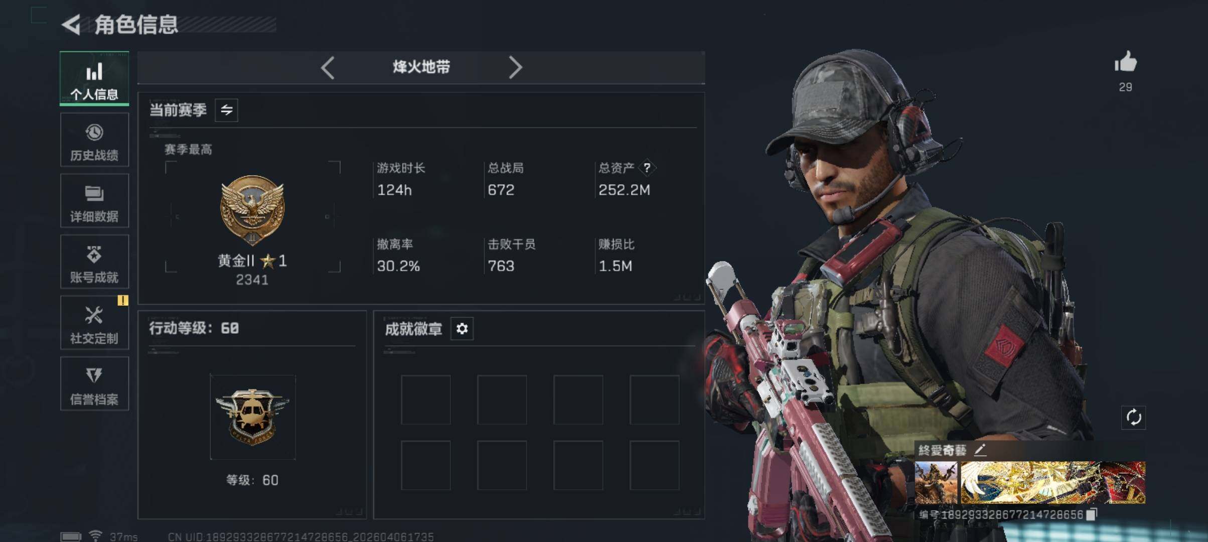 252m总资产-225400k哈夫币-60烽火等级-黄金-16战场等级-上等兵