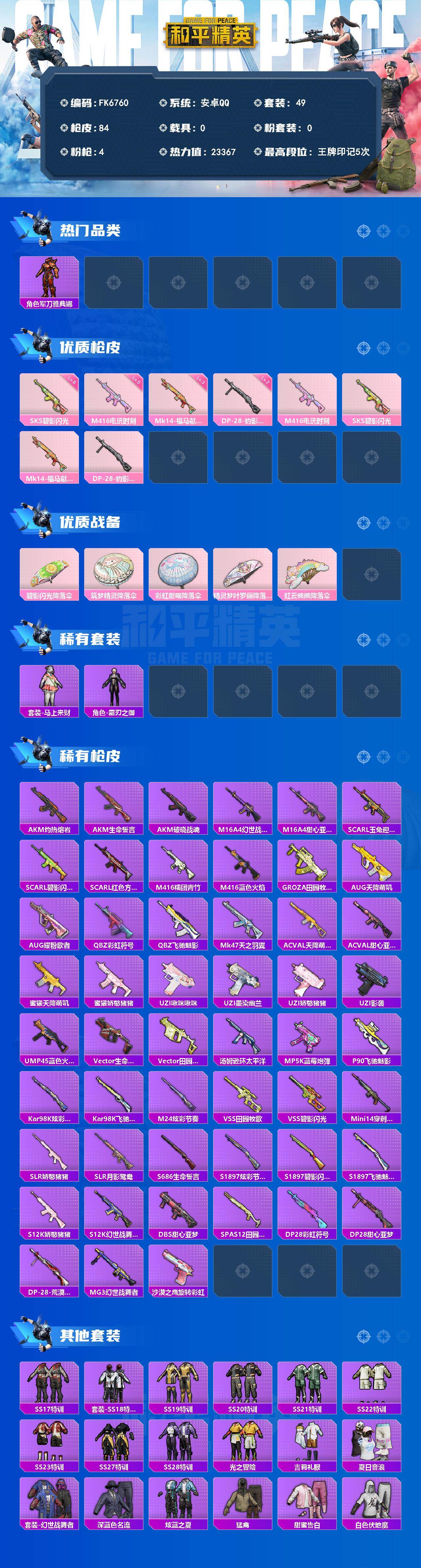 【FK6760】49套装/枪械4/装备74/战备51/王牌印记5/热力值23367/五级M416-电玩时刻/六级SKS-碧影闪光/三级Mk14-福马献瑞/二级DP-28-豹影疾电/军刀雅典娜/M416-电玩时刻/SKS-碧影闪光/Mk14-福马献瑞/DP-28-豹影疾电/碧影闪光降落伞/筑梦精灵降落伞/彩虹甜喵降落伞/精灵梦叶罗丽降落伞/虹云熊熊降落伞/套装-马上来财/角色-霜刃之御/AKM-灼