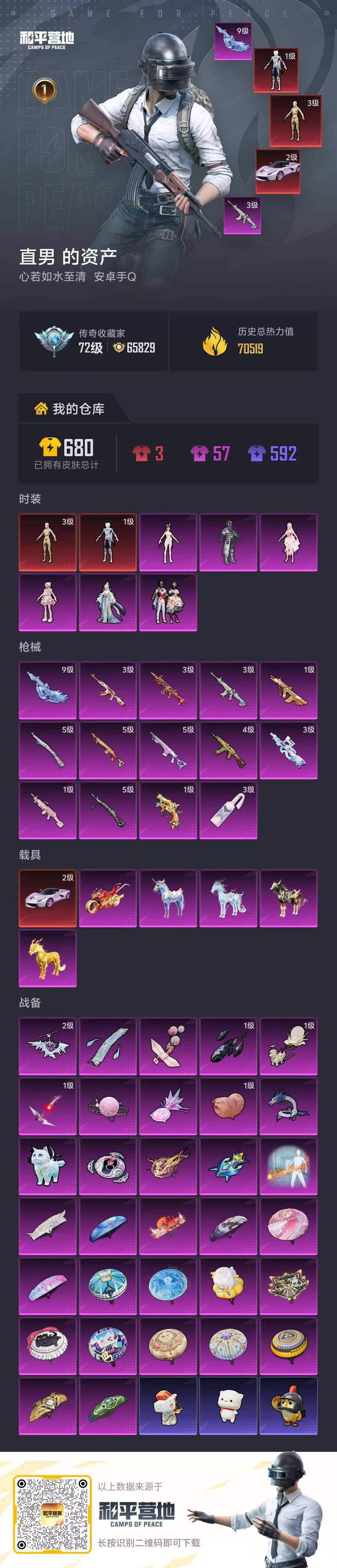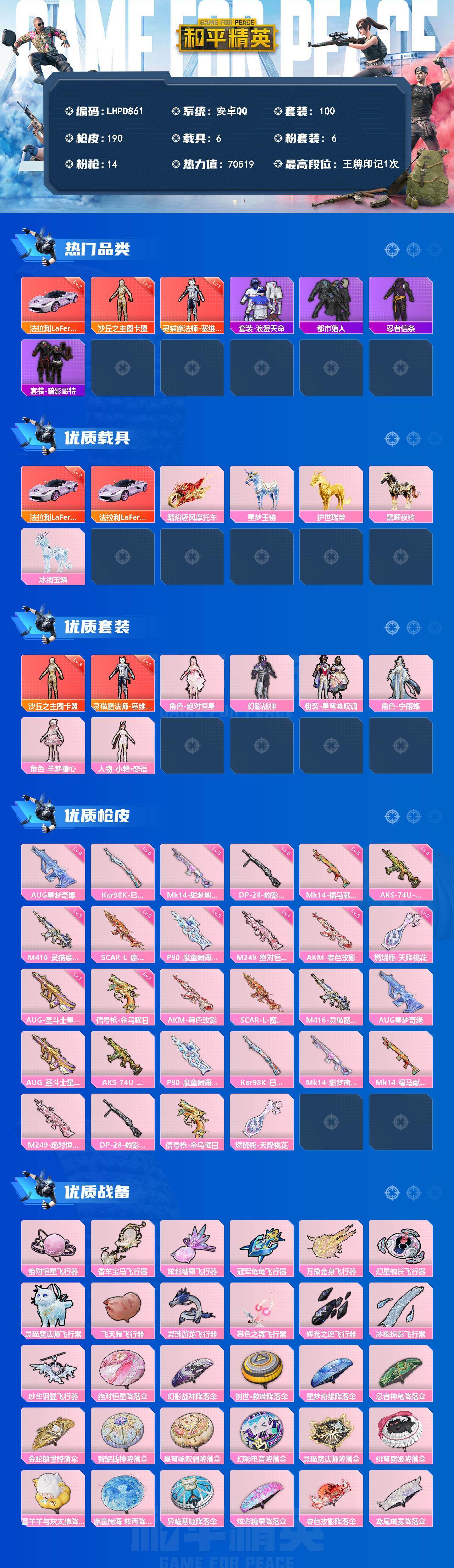 满9级aug星梦奇缘【店主推荐捡漏号!可直接换绑】安卓 手Q-2神装-6粉装-14特效枪-6载具-14粉色飞行器-70519热力值-1王牌印记-100套装-190枪皮