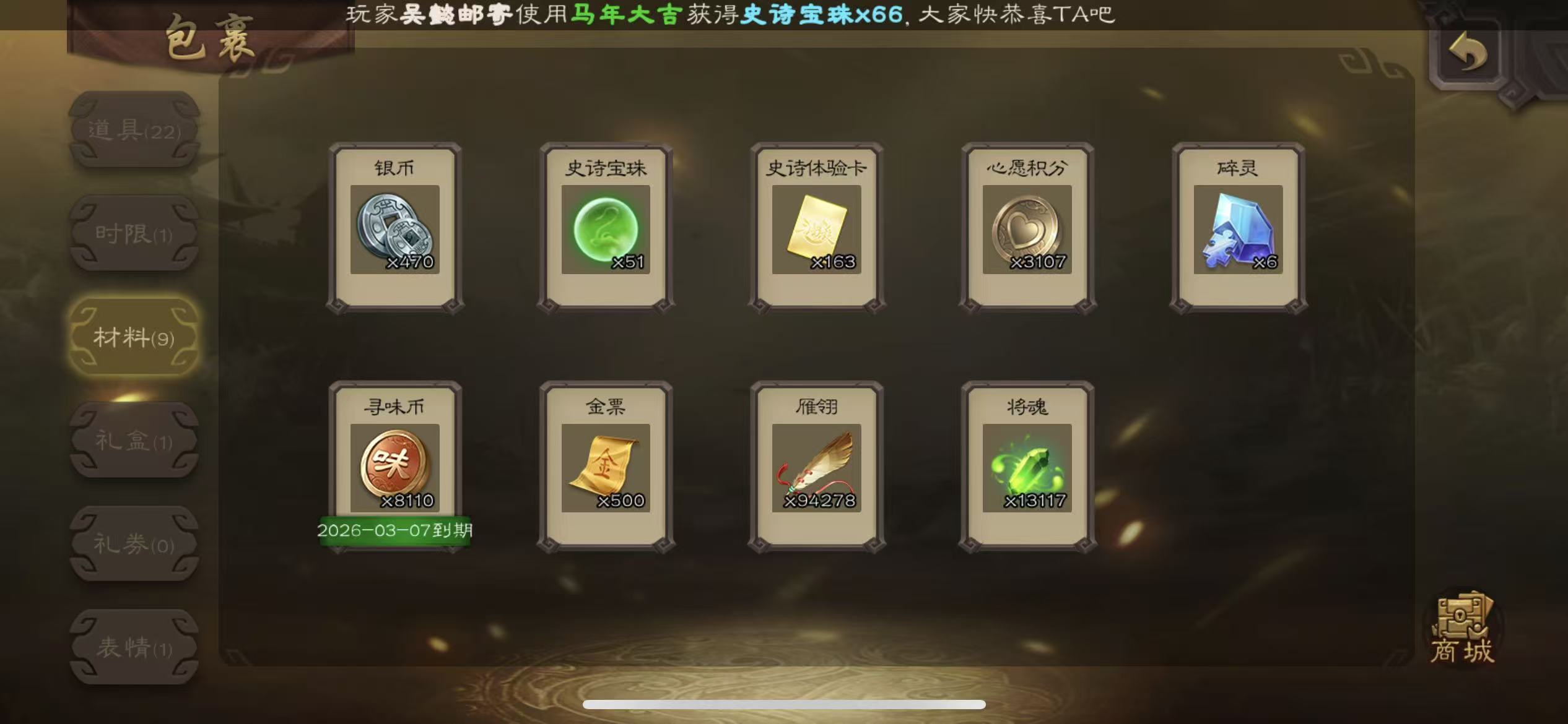 先锋谋诸葛亮51宝珠(可换小鸟势幸宪英势国渊势陆郁生司马昭等其一)9万羽毛1.3万将魂三卡
