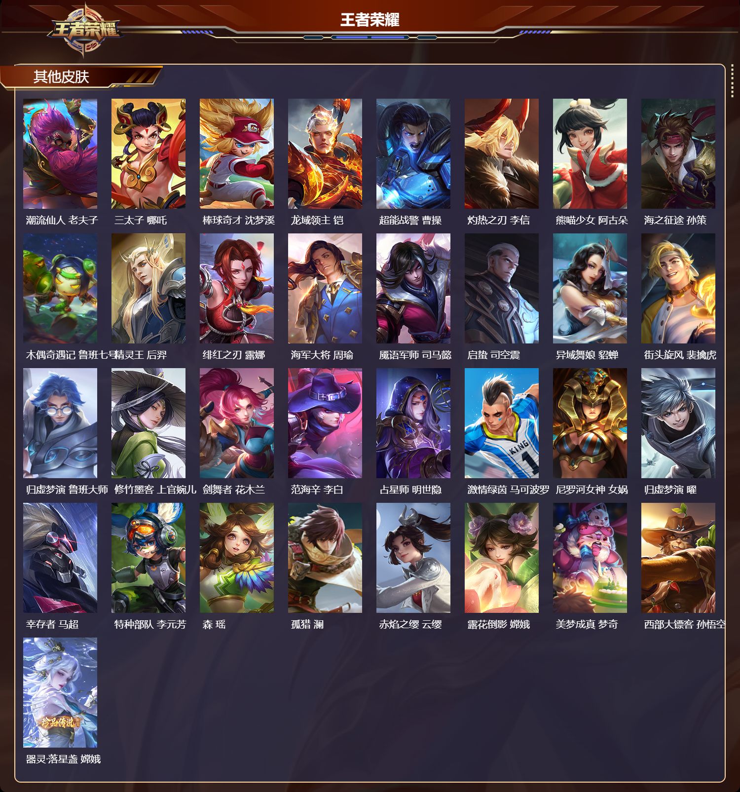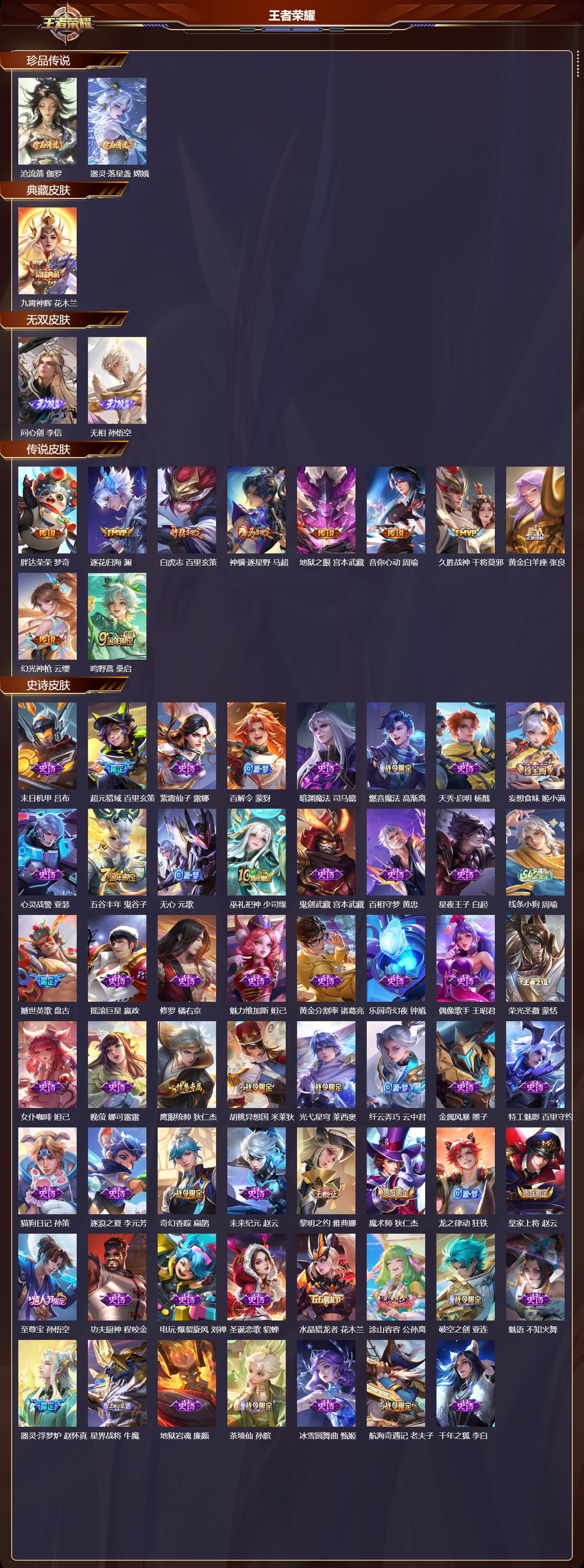 最强王者/239皮肤/127英雄/1典藏/0珍品无双/2无双/2珍品传说/10传说/73史诗/8稀有英雄