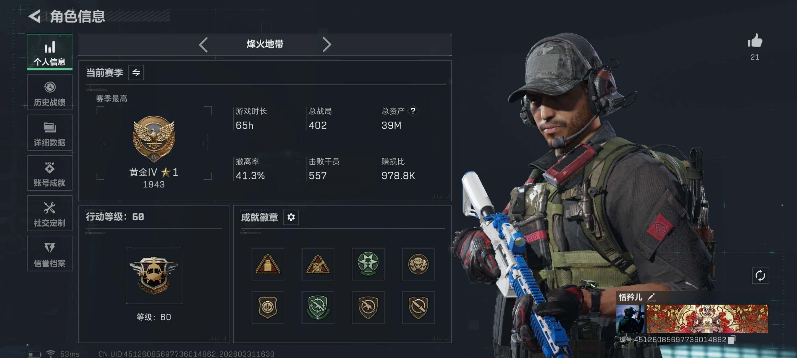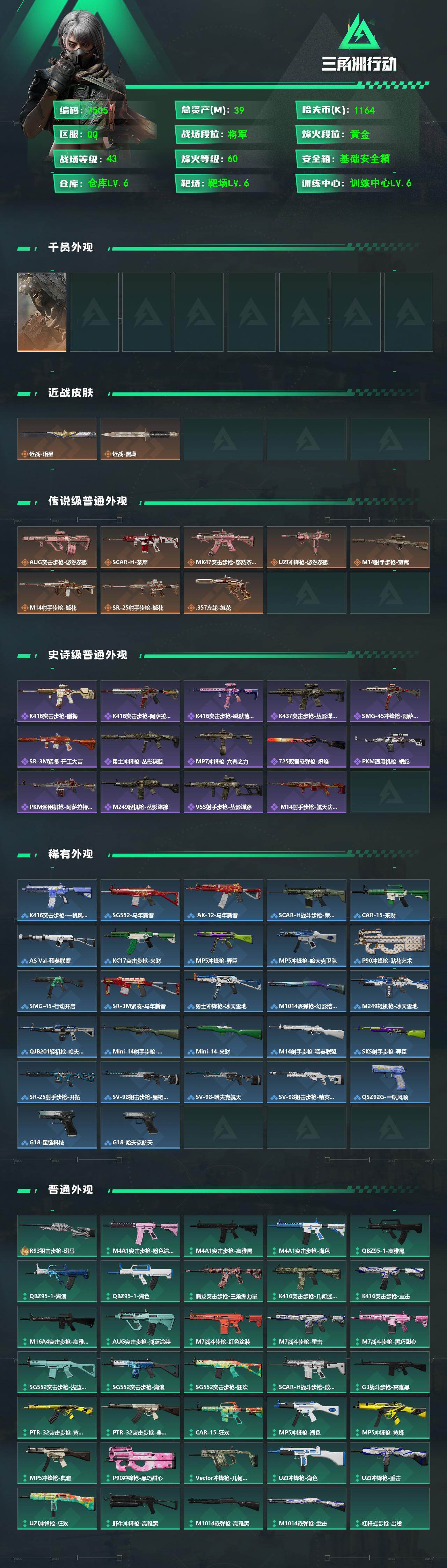 总资产39M/哈夫币116万/传说近战数1/传说枪皮数8/战场等级43/行动等级60/安全箱等时效性道具以游戏内数据为准,详情请看图/乌鲁鲁-荒原猎手/近战-暗星/近战-黑鹰/AUG突击步枪-悠然茶歇/SCAR-H战斗步枪-荼蘼/MK47突击步枪-悠然茶歇/UZI冲锋枪-悠然茶歇/M14射手步枪-蛮荒/M14射手步枪-缄花/SR-25射手步枪-缄花/.357左轮-缄花/K416突击步枪-腊梅/