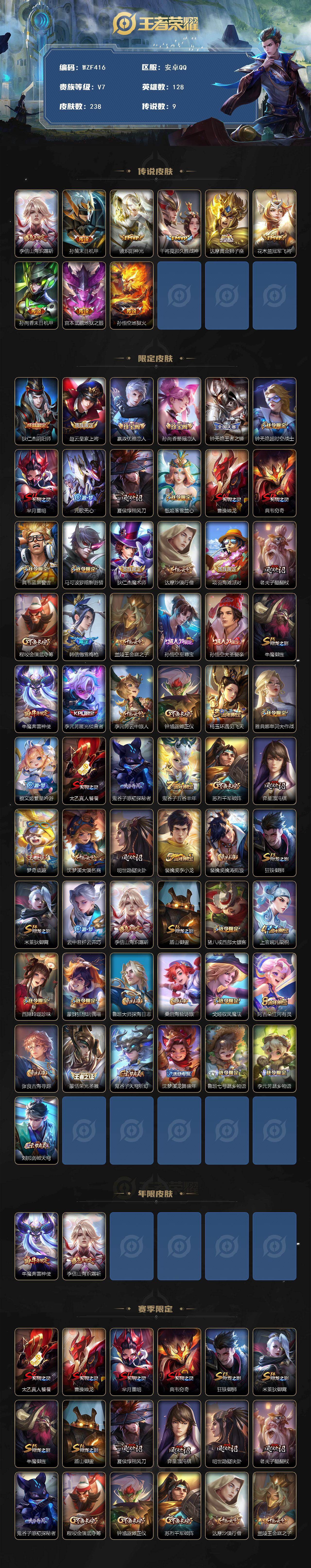 【WZF416】贵族7/皮肤238/传说9/史诗59/英雄128/敖隐全皮/李信-山海·炽霜斩/孙策-末日机甲/镜-炽阳神光/干将莫邪-久胜战神/达摩-黄金狮子座/花木兰-冠军飞将/孙尚香-末日机甲/宫本武藏-地狱之眼/孙悟空-地狱火/狄仁杰-阴阳师/赵云-皇家上将/嬴政-优雅恋人/孙尚香-蔷薇恋人/钟无艳-王者之锤/钟无艳-超时空战士/芈月-重明/元歌-无心/夏侯惇-朔风刀/甄姬-落雪兰心/曹操-烛龙/典韦-穷奇/典韦-蓝屏警告/马可波罗-暗影游猎/狄仁杰-魔术师/达摩-沙漠行僧/项羽-海滩派