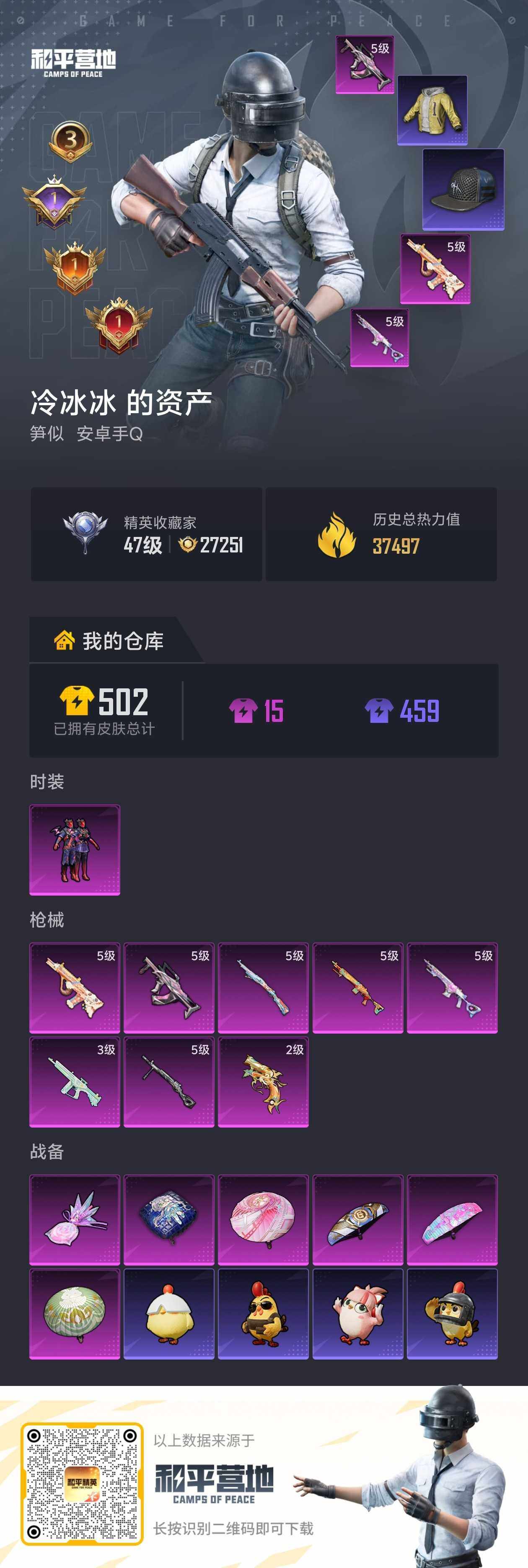 安卓 手Q-1粉装-8特效枪-0载具-1粉色飞行器-37497热力值-3王牌印记-110套装-145枪皮