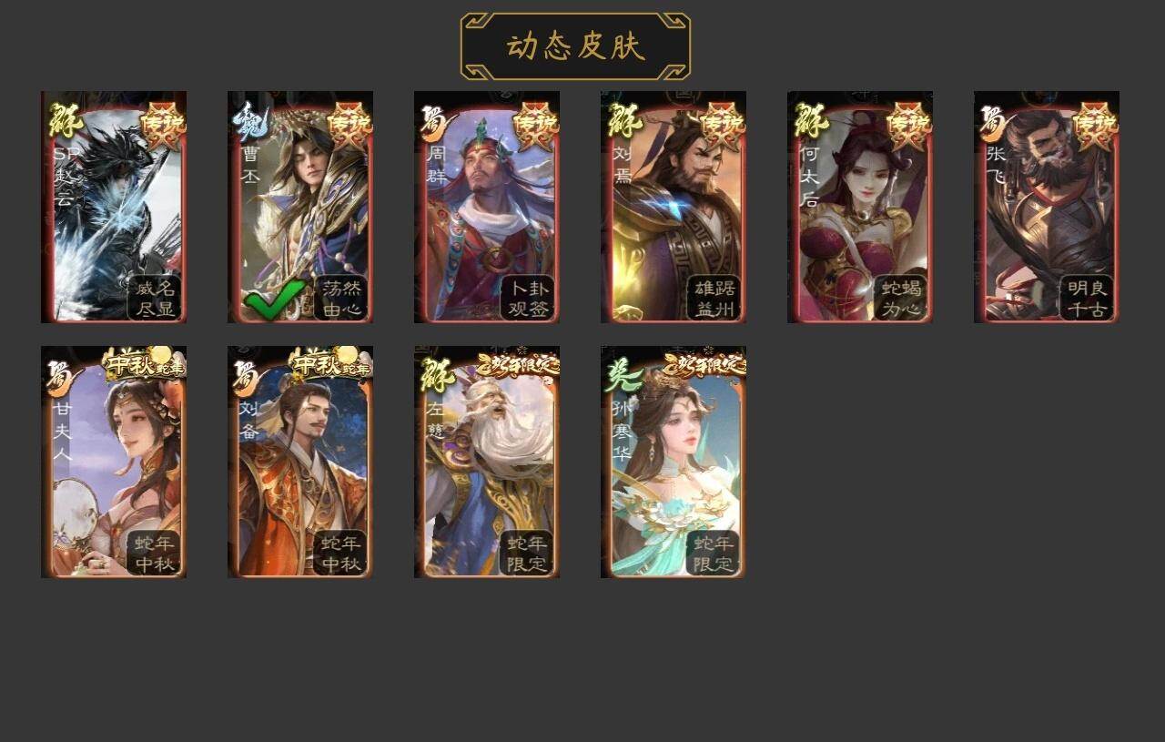 官阶:领军将军;VIP等级:VIP9;史诗武将数量:15;动态皮肤数量:8;武