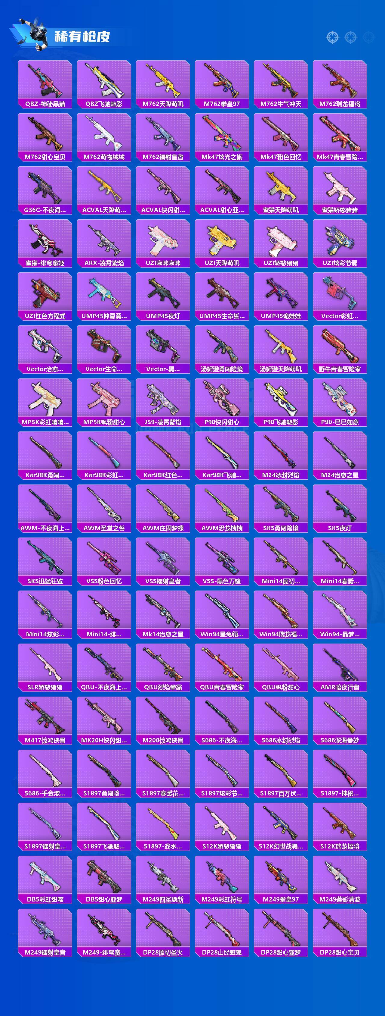 【粉色枪皮等级】:M16A4-晶梦幻蝶(四级),UMP45-萌骑冒险(二级),汤姆逊-热量炸弹(四级),Kar98K-巳巳如意(四级),DP-2
