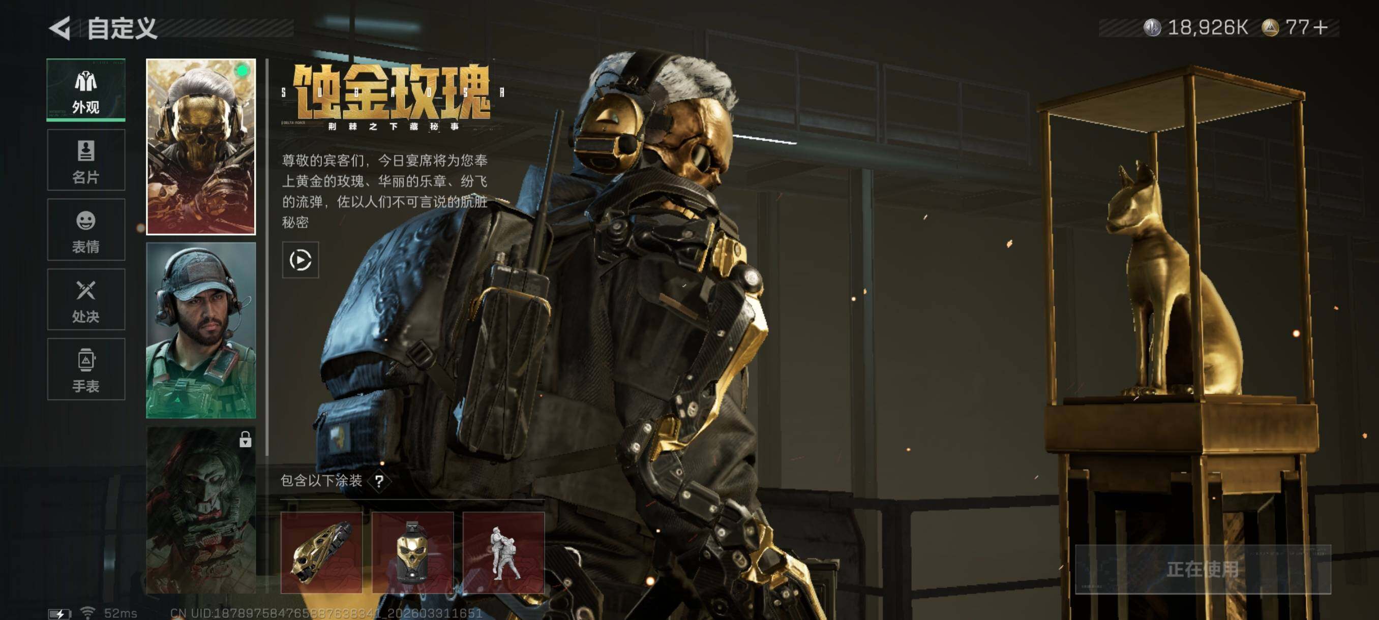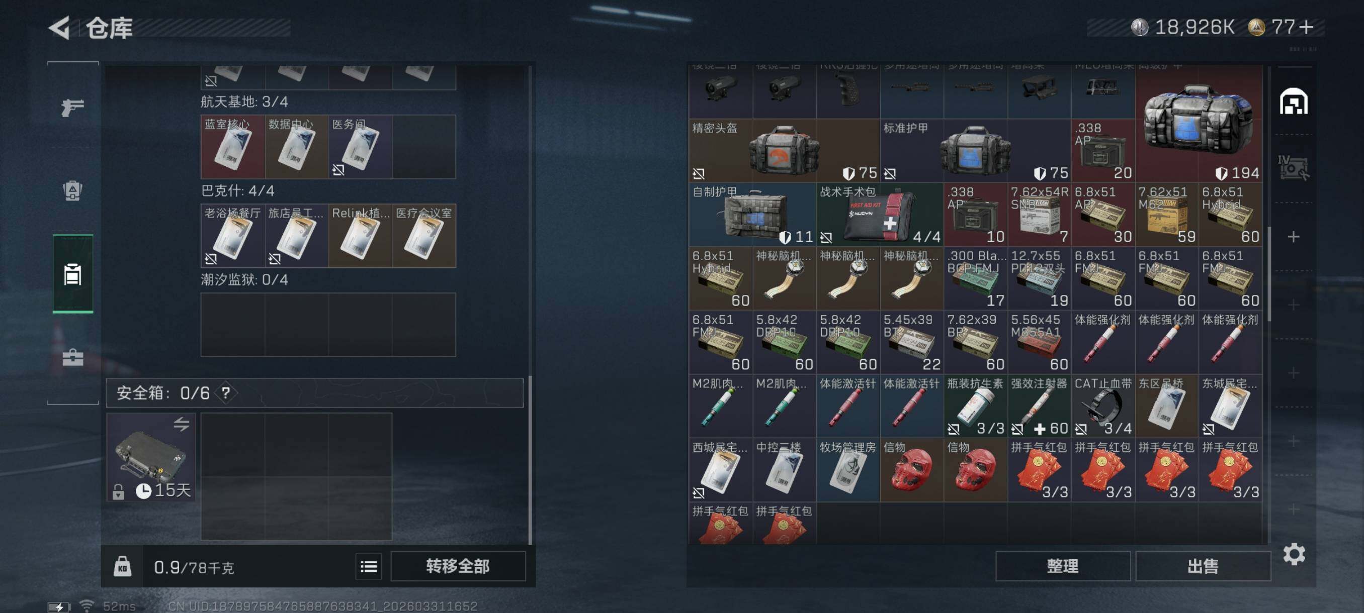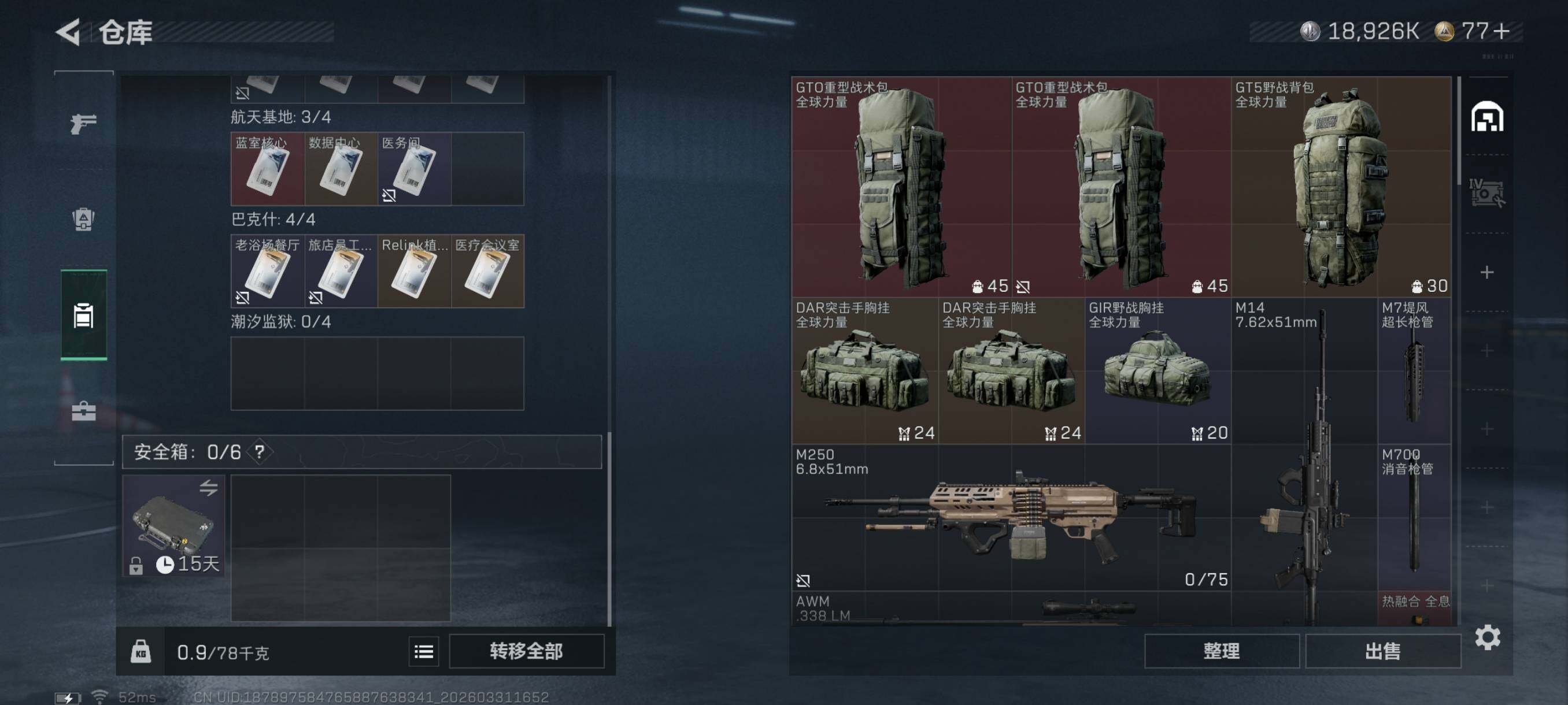 总资产51M/哈夫币1892万/传说近战数1/传说枪皮数19/战场等级18/行动等级58/安全箱等时效性道具以游戏内数据为准,详情请看图/红狼-蚀金玫瑰/近战-暗星/近战-黑鹰/M4A1突击步枪-蚀金玫瑰/AKM突击步枪-锦绣/K416突击步枪-行动记录/AUG突击步枪-悠然茶歇/腾龙突击步枪-马年祥瑞/腾龙突击步枪-万金泪冠/K437突击步枪-锦绣/MK47突击步枪-悠然茶歇/MK47突击步