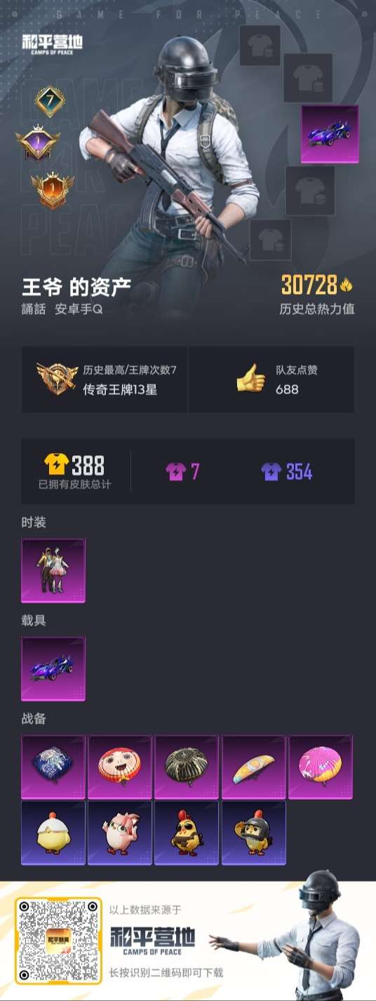 有二次【1载具-1粉装 蝶舞迷情 小丑鱼】安卓手Q-1载具-1粉装-90套装-101枪皮-7王牌印记-坚韧铂金Ⅴ-30728热力值【1载具】海龙奔腾【1粉装】蝶舞迷情【2稀有】小丑鱼,AKM-百万伏特【1飞行器】粉色滑翔尾迹【188其它衣服和枪皮】竞技名士,SS20特训,SS22特训,玩偶服-超人强,快闪甜心,田园牧歌,和煦暖阳,黄色运动,电音精灵,吉莉礼服,猎鹰,牛气冲天,惊鸿侠骨,红色运动,S