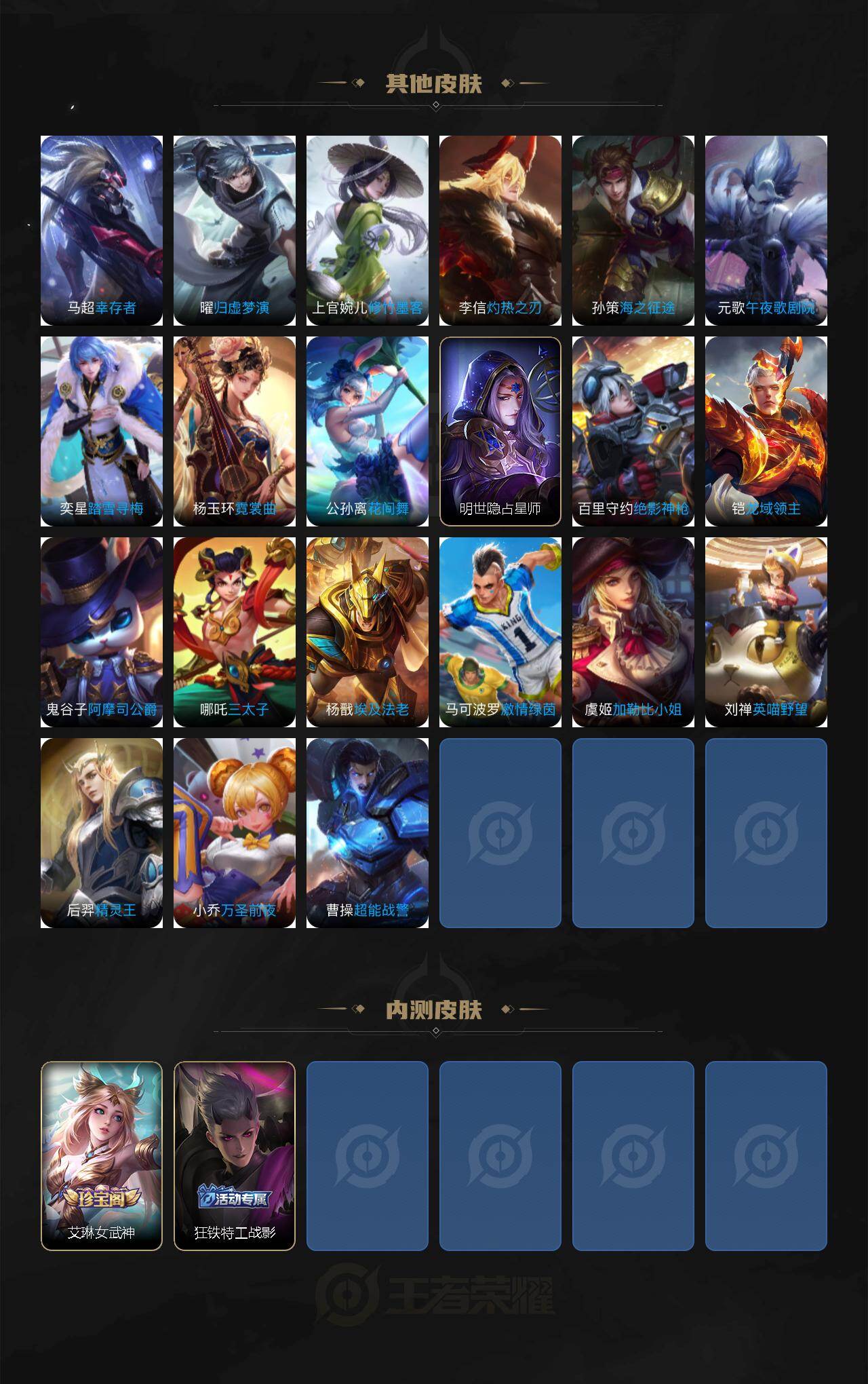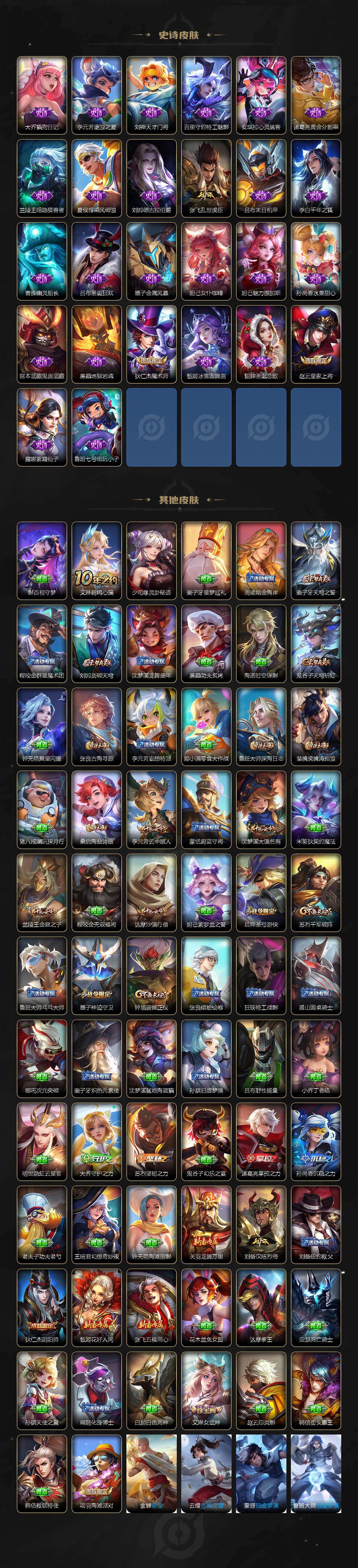 【限定皮肤】:蒙犽顽岩魄,姜子牙天穹之誓,狄仁杰阴阳师,赵云皇家上将,墨子神迹守卫,庄周高山流水,狄仁杰魔术师,达摩沙漠行僧,项羽海滩派对,老夫子航海奇遇记