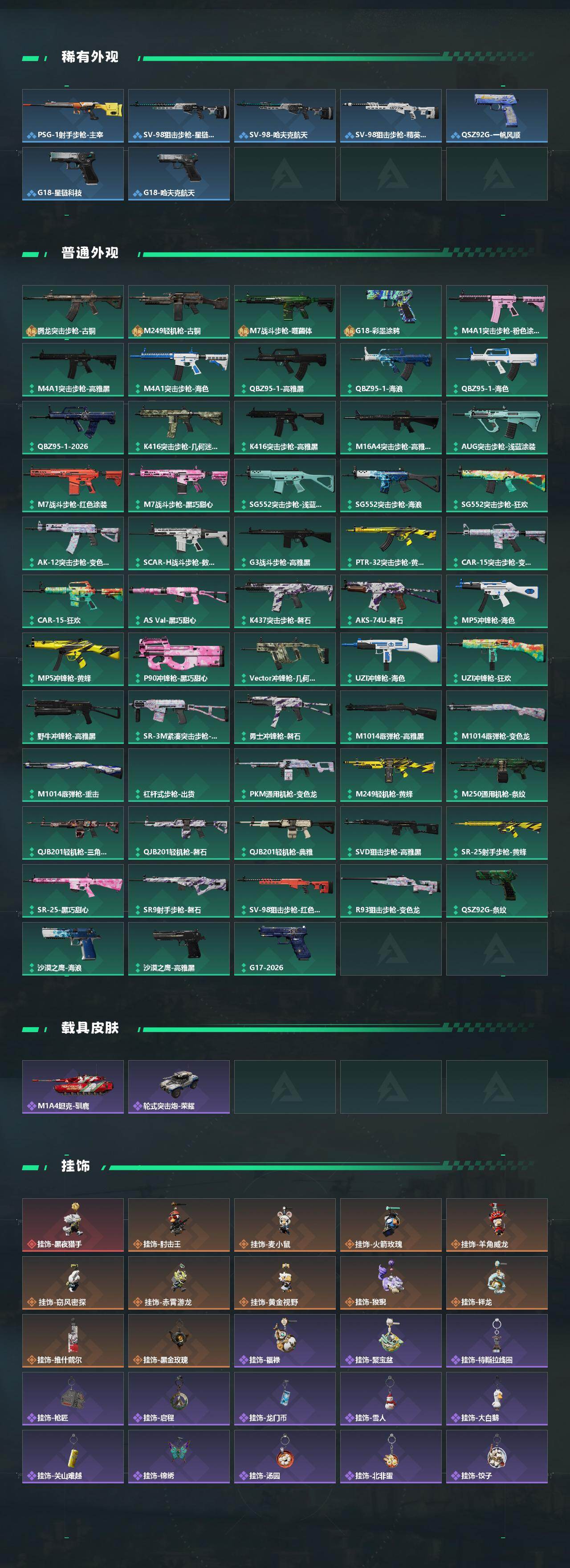 【传说外观】:M4A1突击步枪-蚀金玫瑰,M4A1突击步枪-阿米娅,AKM突击步枪-锦绣,ASh-12战斗步枪-鹅鸭杀,AUG突击步枪-悠然茶歇,SG552突击步枪-运动员,AK-12突击步枪