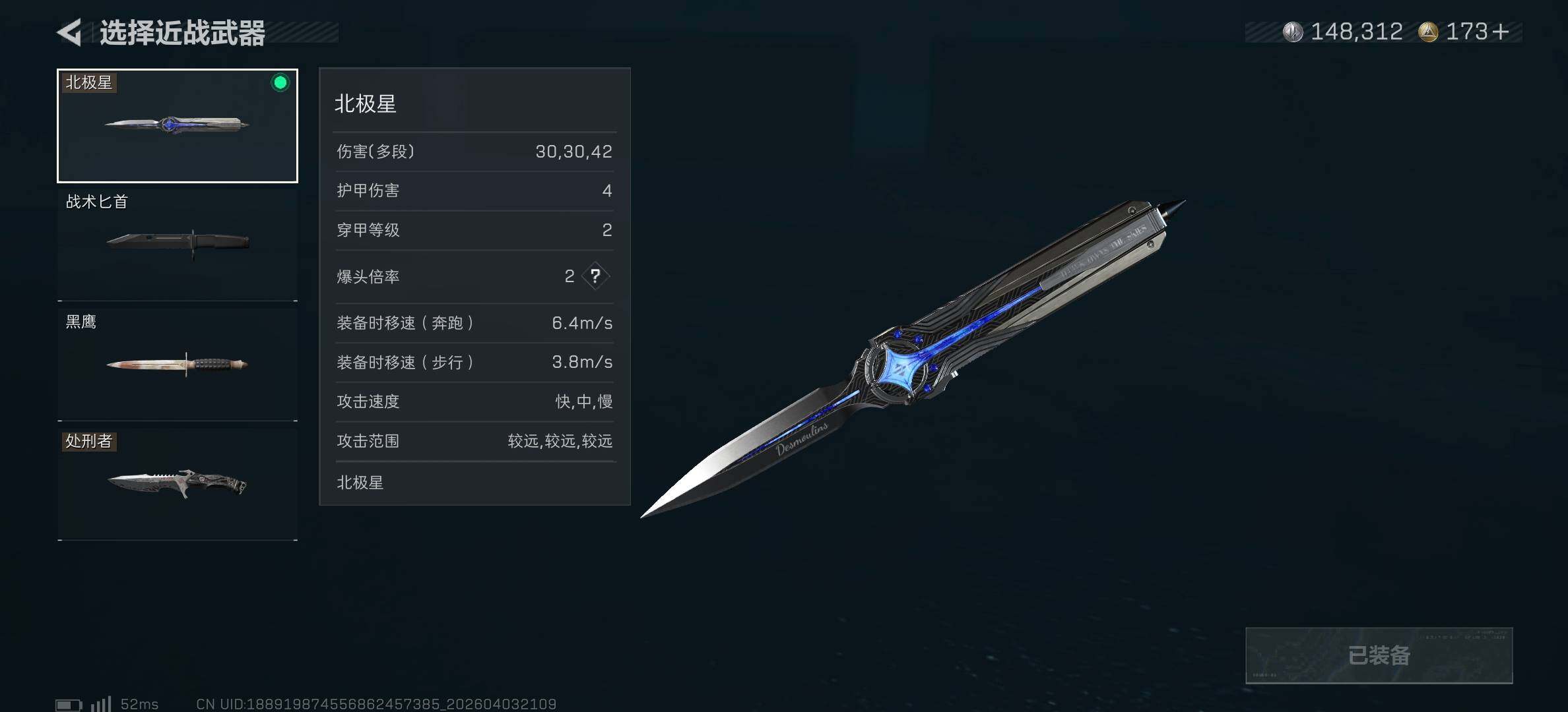【近战皮肤】:近战-北极星,近战-处刑者1级,近战-黑鹰